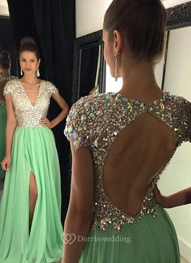 Stunning Cap Sleeve Crystal Prom Dresses Open Back Long Chiffon Prom Gown