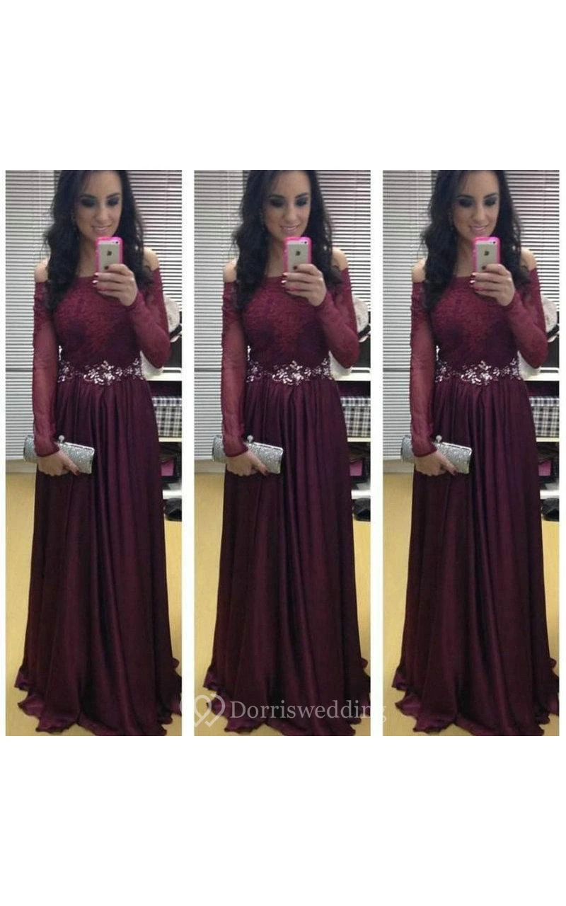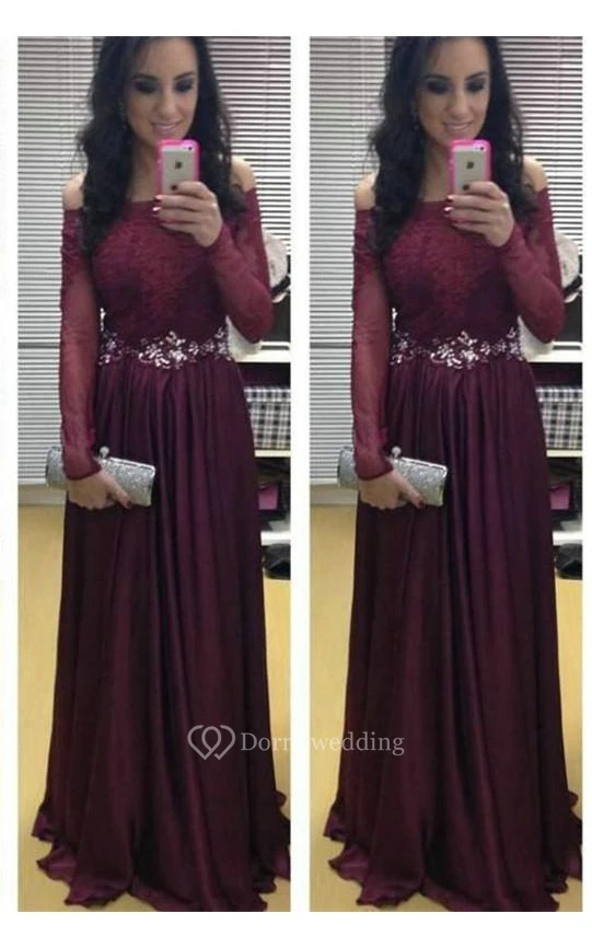Stunning Long Sleeve Off-the-shoulder Evening Dresses Burgundy Lace Appliques Crystal
