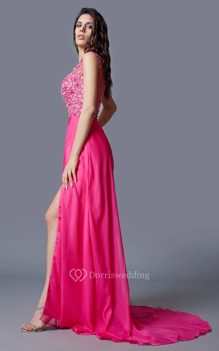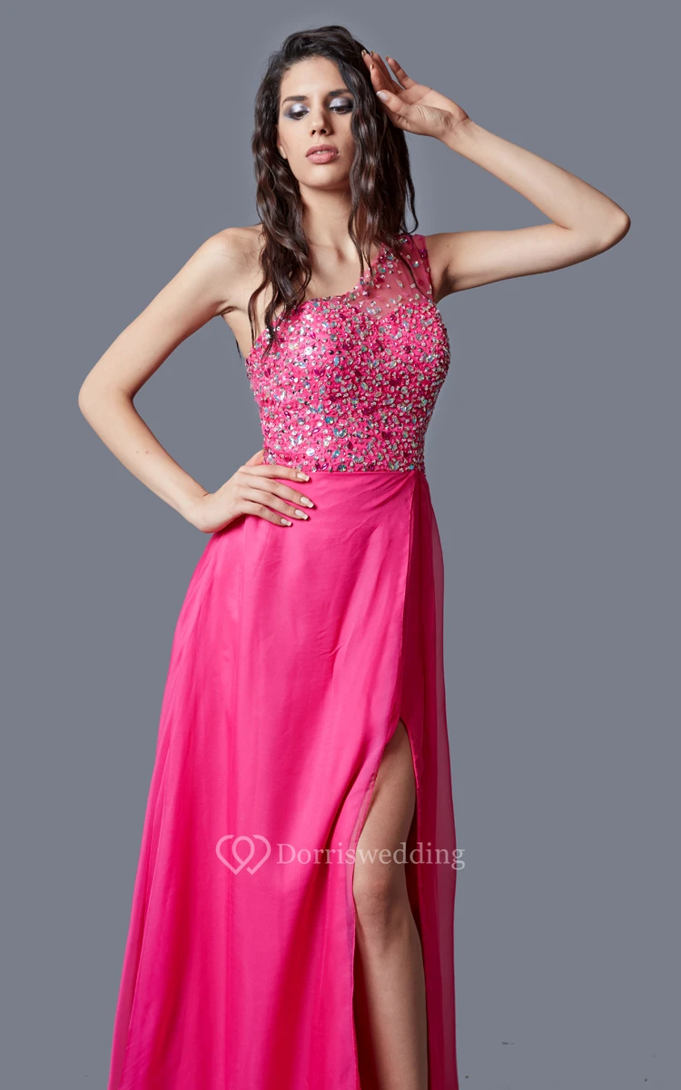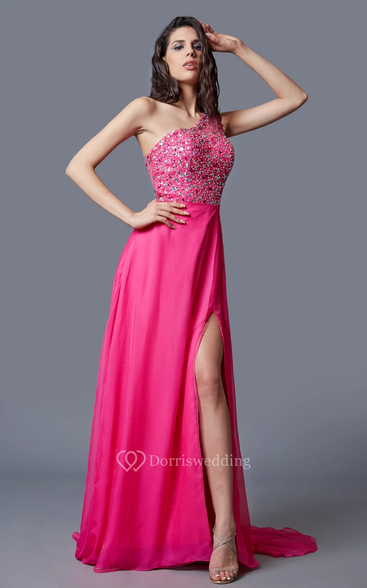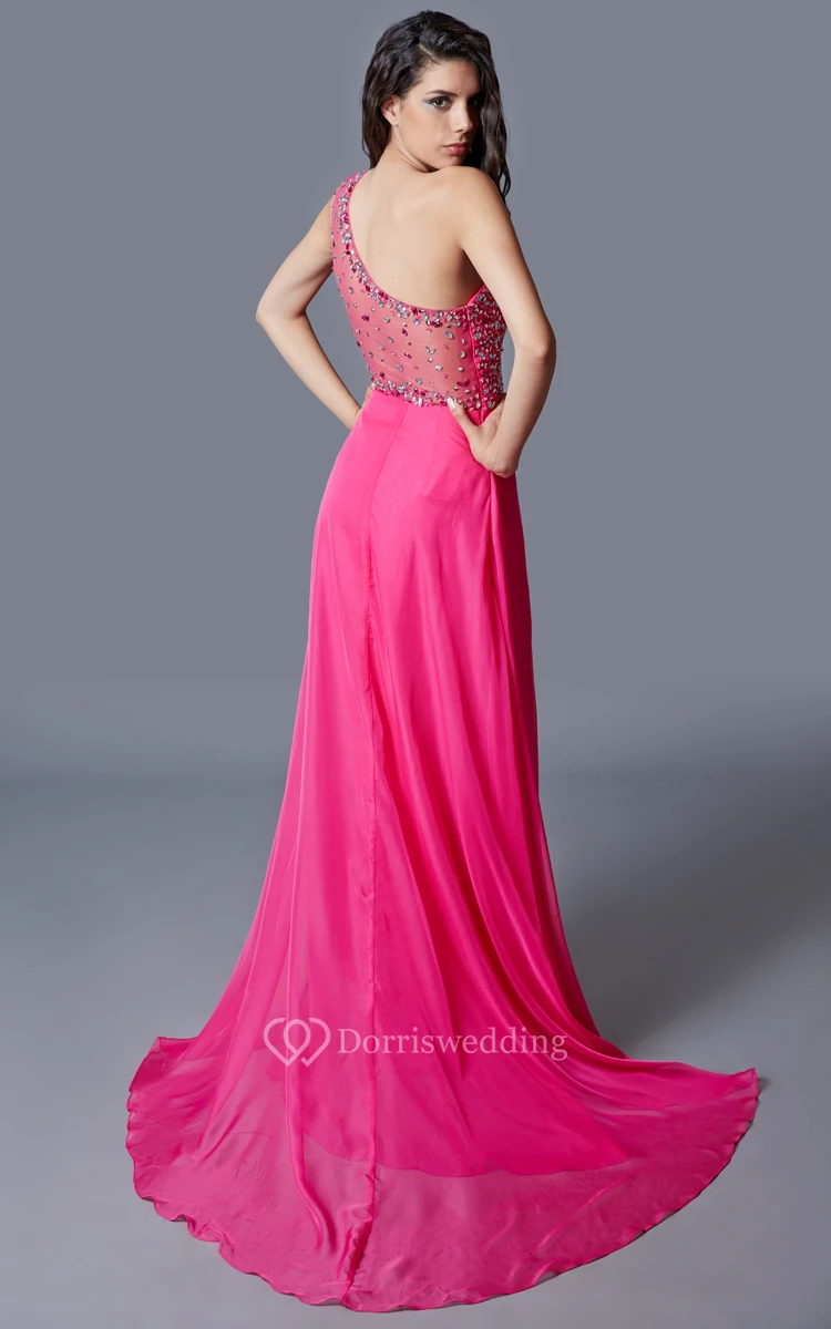 Stunning One-shoulder Multicolor-beaded Chiffon Prom Gown With Sheer Back