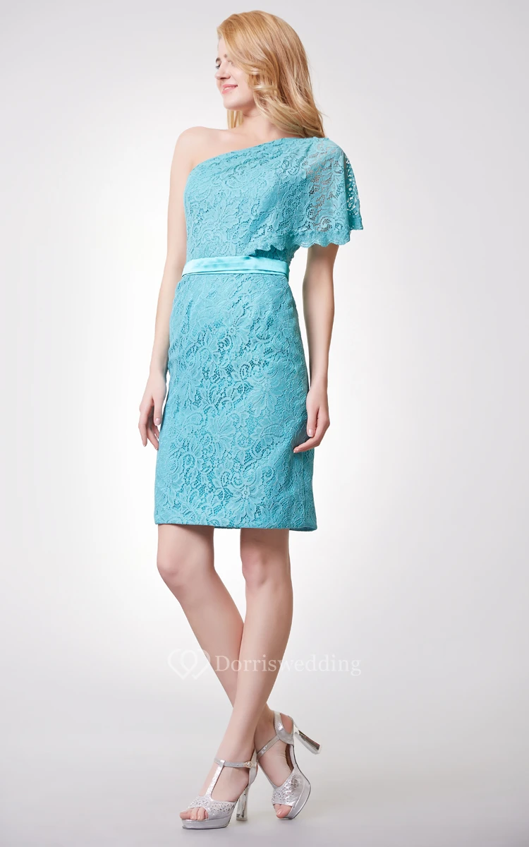 Stunning One Shoulder Short Lace Dress With Satin Sash