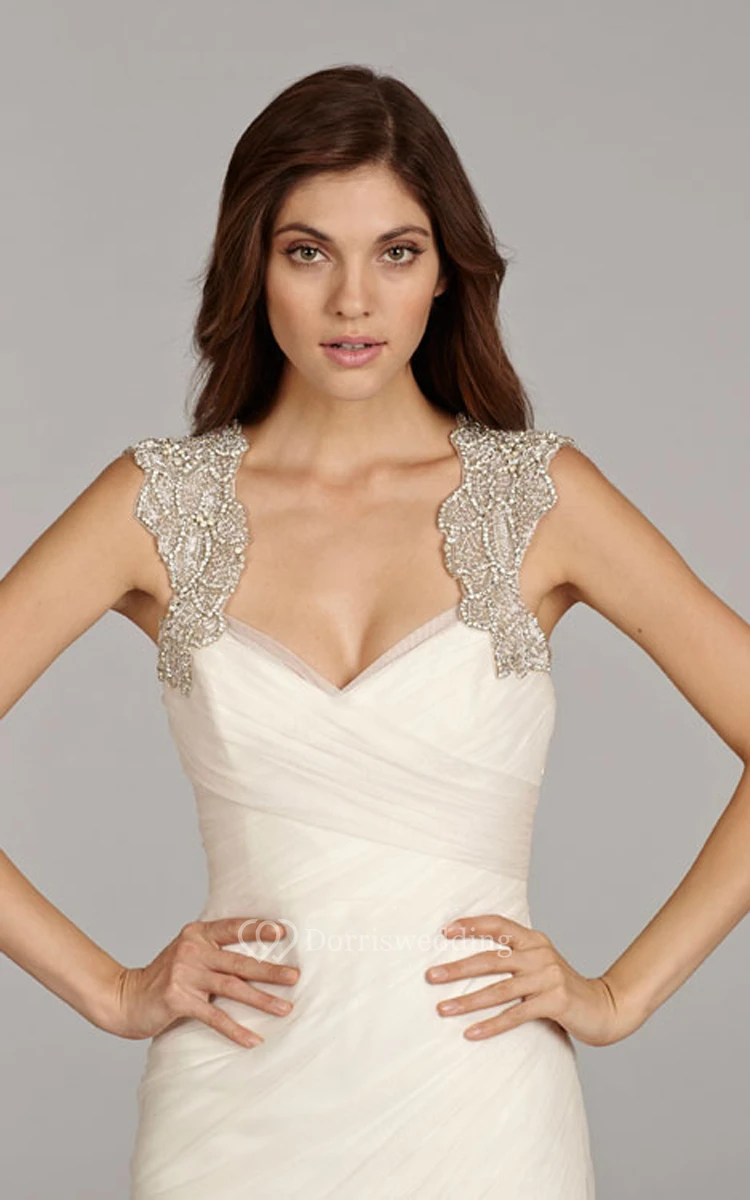Delicate organza makes this soigné gown a veritable essence of purity and lightness. Sweetheart neckline features scalloped edge beaded lace straps running into a gorgeous key-hole back forming two angel wings. Ruched bodice wraps you in a perfectly fitting mermaid silhouette with a dramatically flaring below the hipline skirt adorned with a ruffled cascade and sweep train.