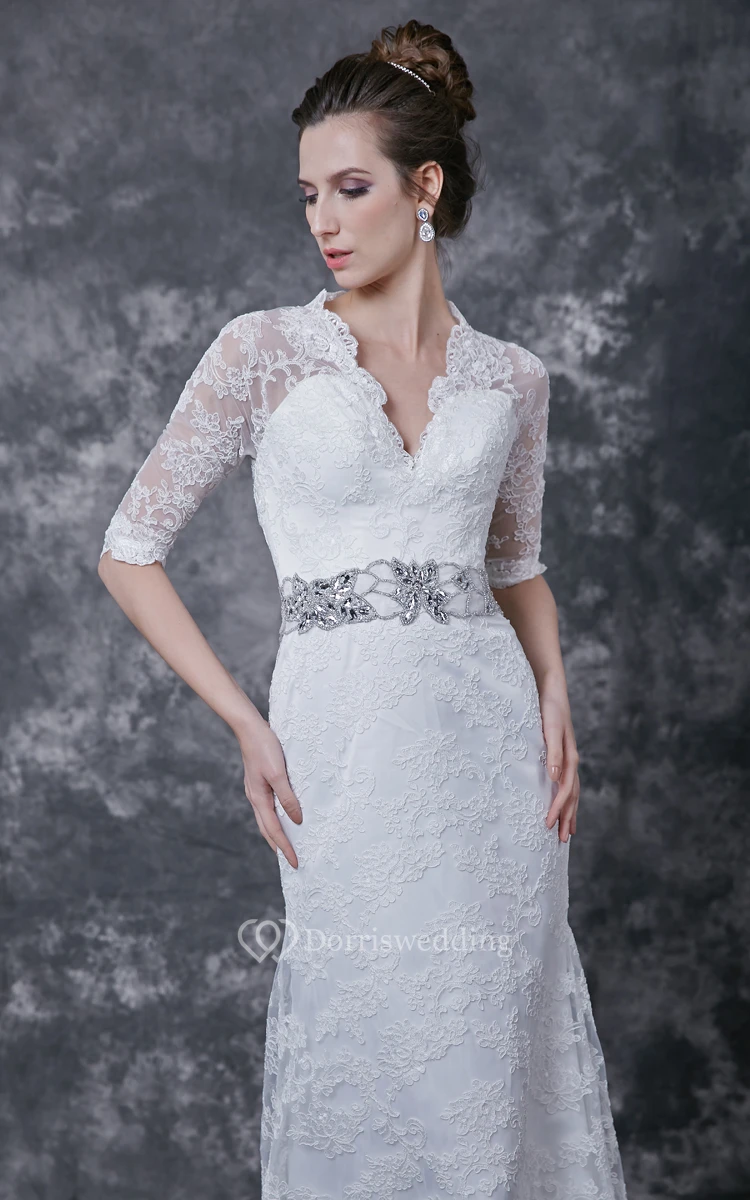 Stylish 3 4 Sleeve Long Lace Dress With Crystal Embellished Waist
