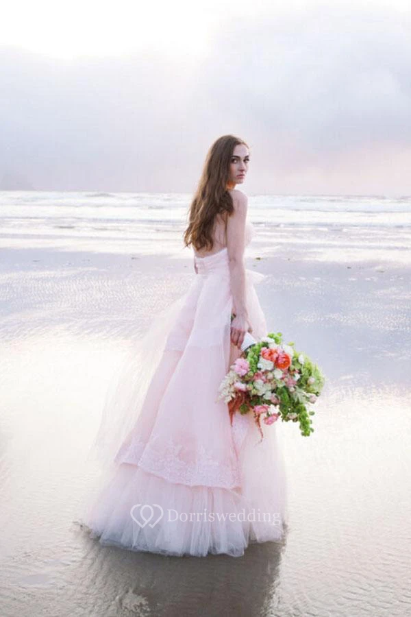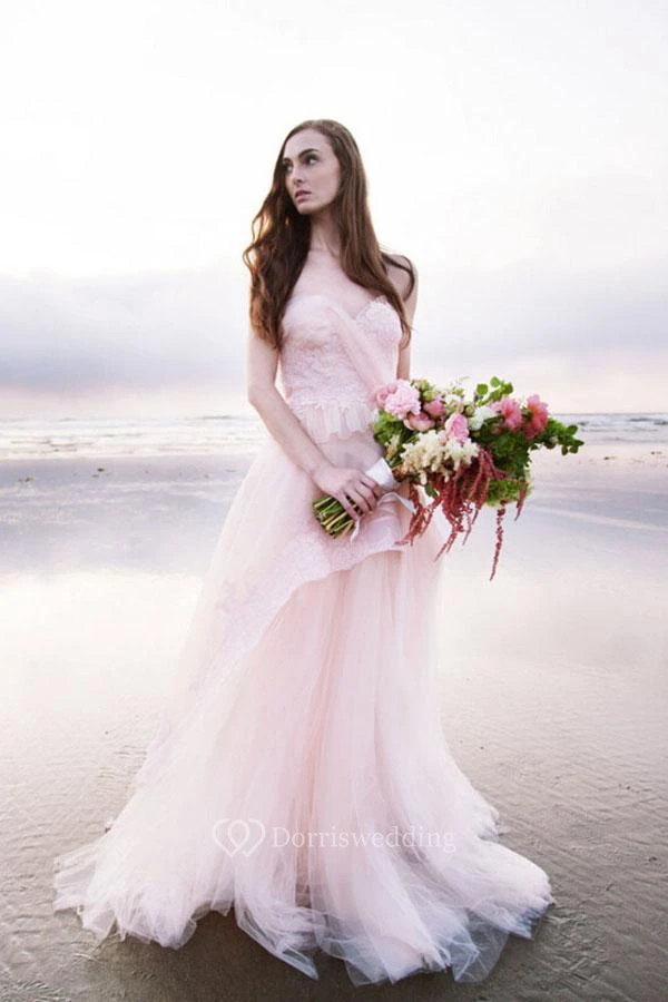 Subtle Pink Strapless Sweetheart A-line Tulle Beach Wedding Dress