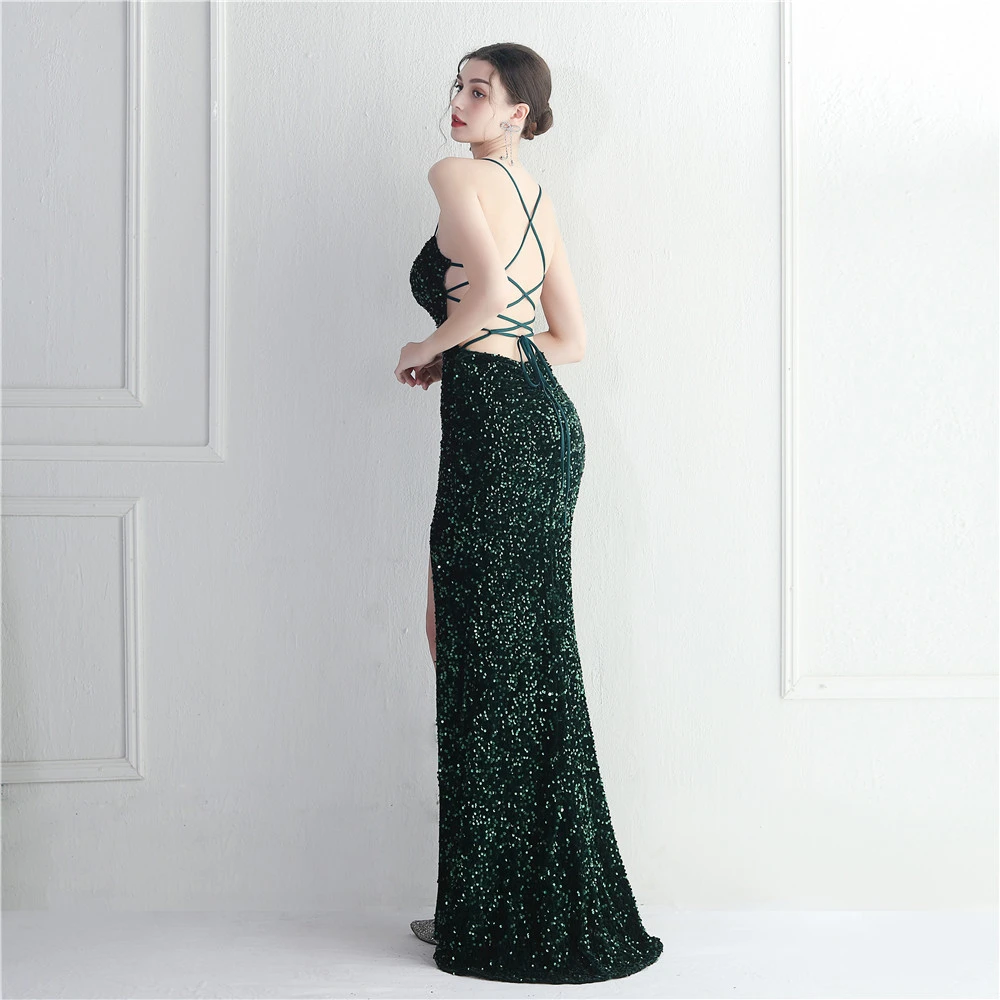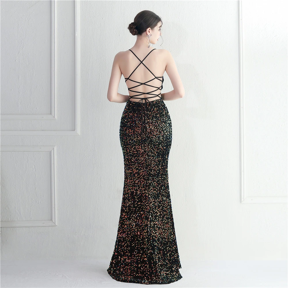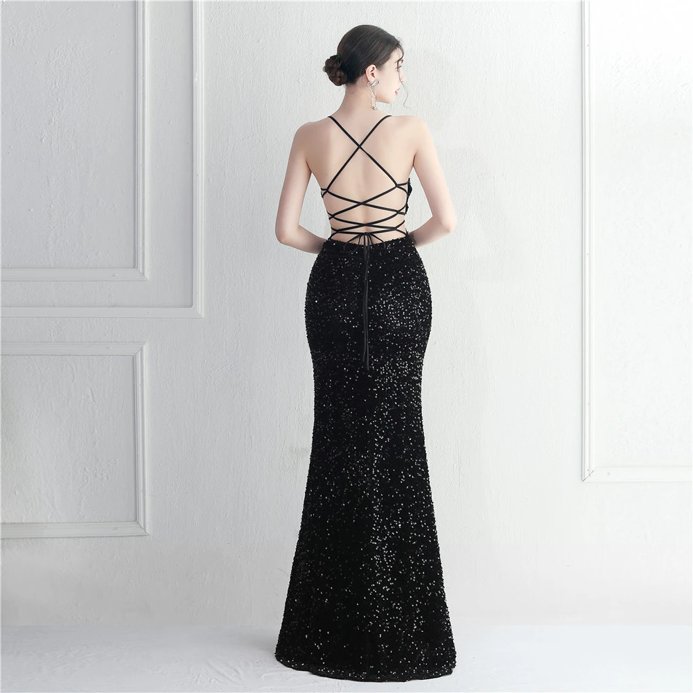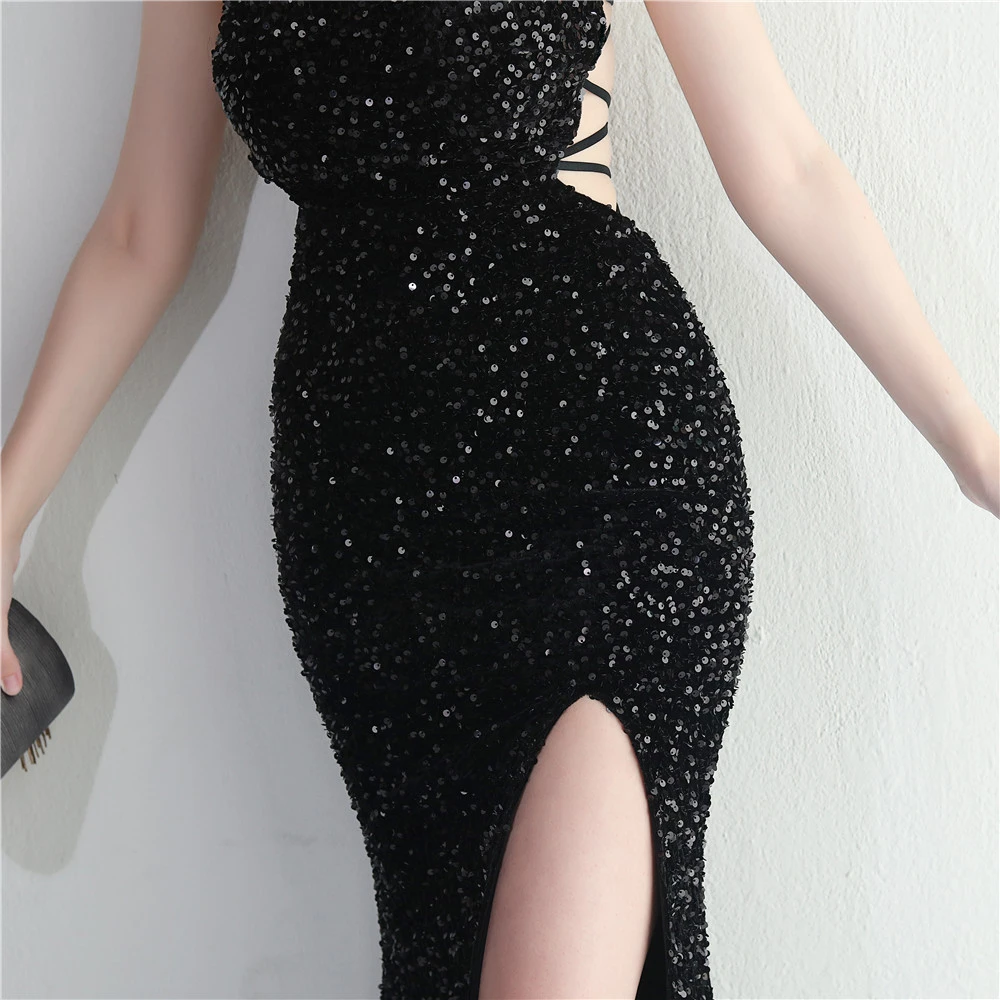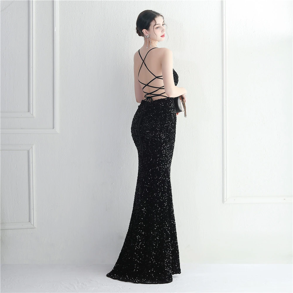 Supply Velvet Bottom Sequin European And American Halter Neck Sling Nightclub Dress Long Fishtail Evening Dress