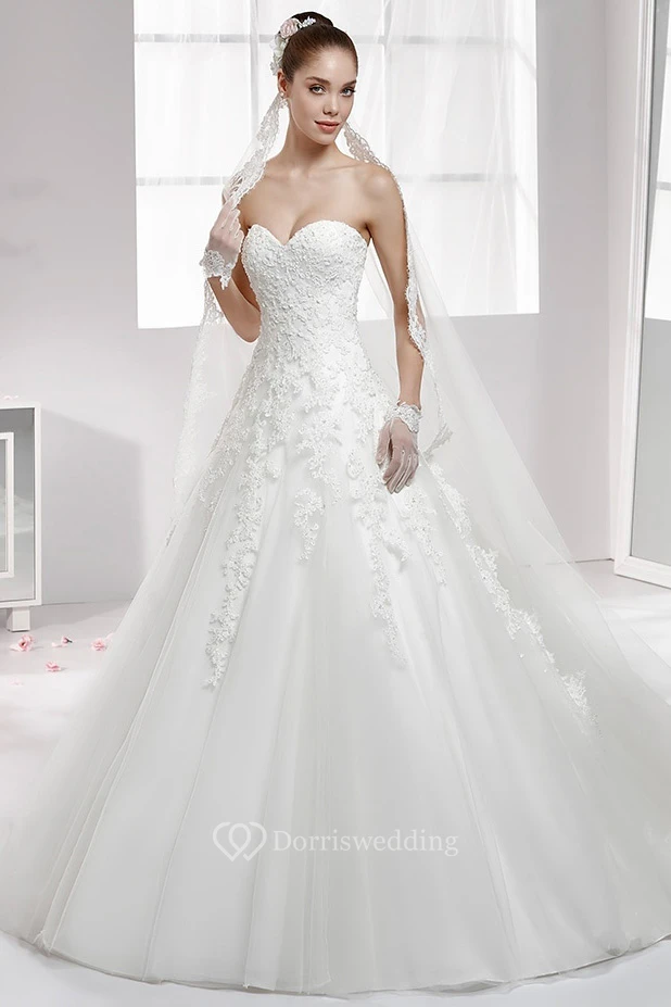 Sweetheart A-line Lace Wedding Dress With Court Train and Applique Bodice