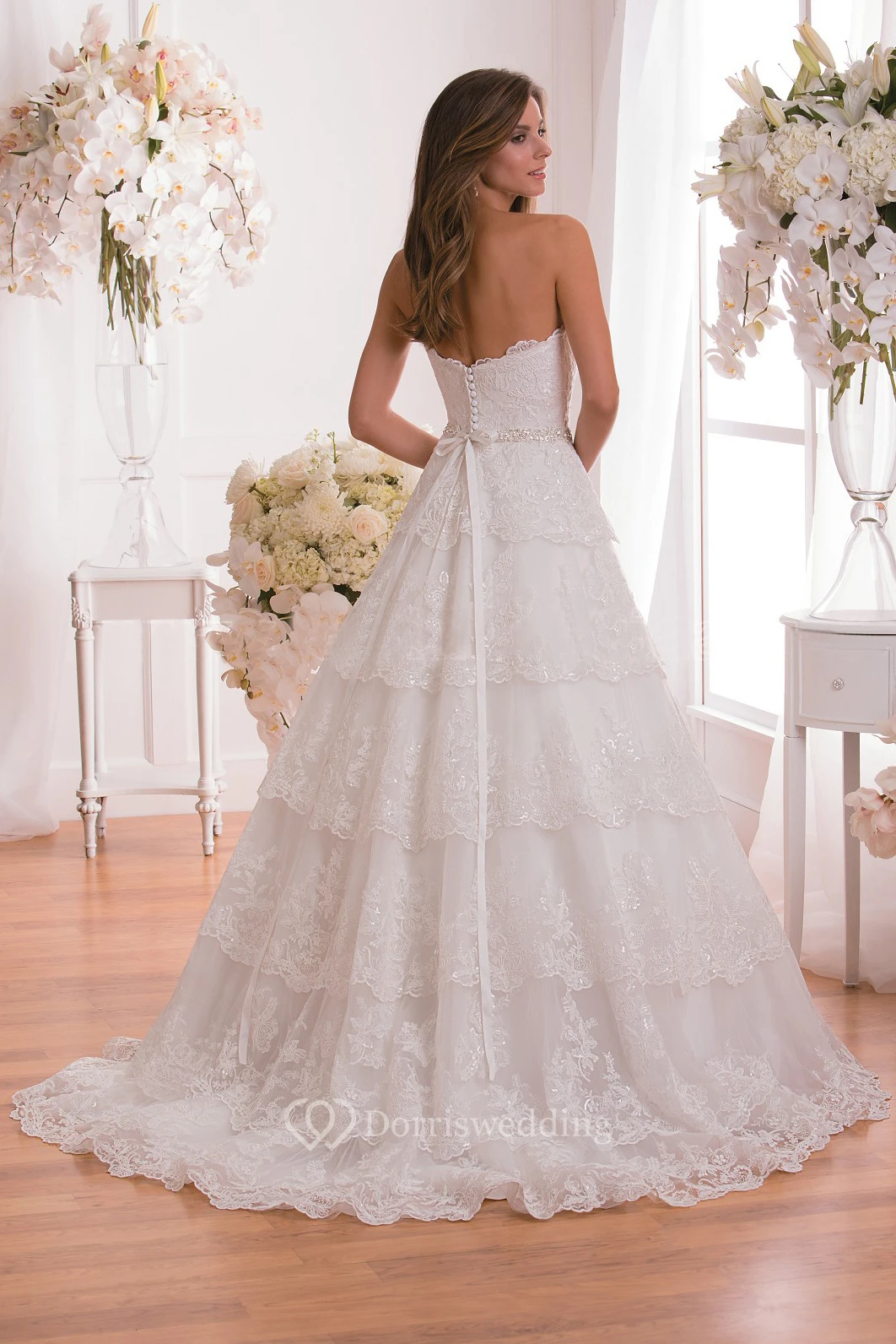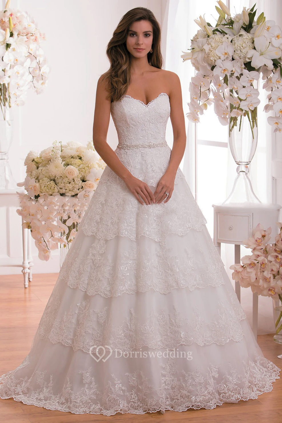 Sweetheart A-Line Tiered Wedding Dress With Lace Detail And Crystals