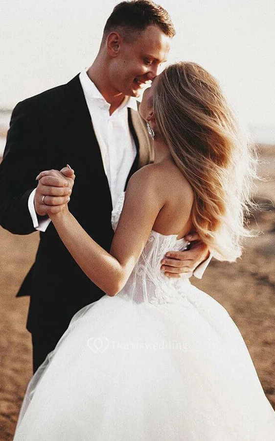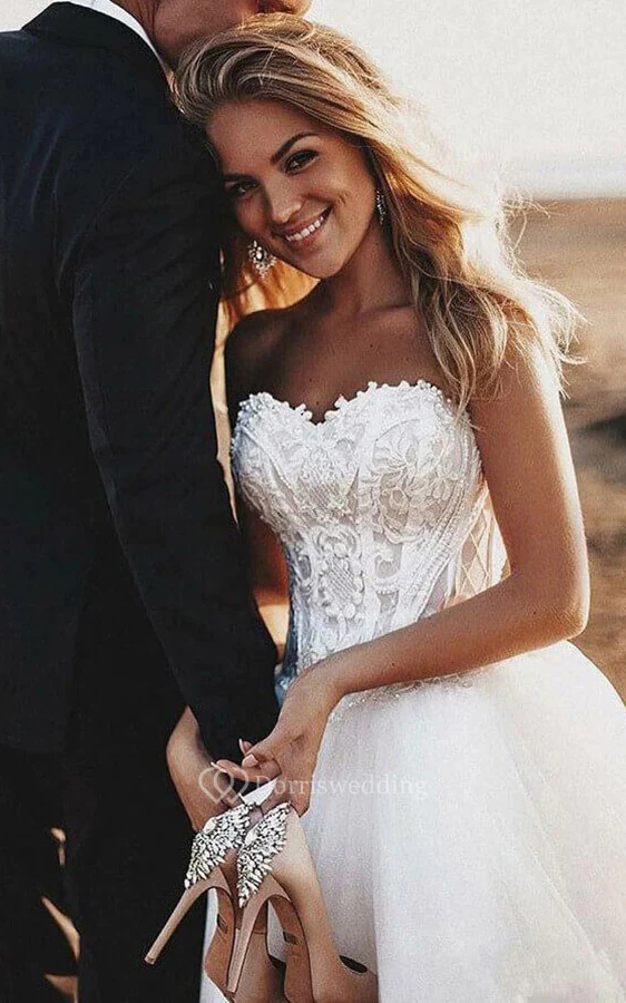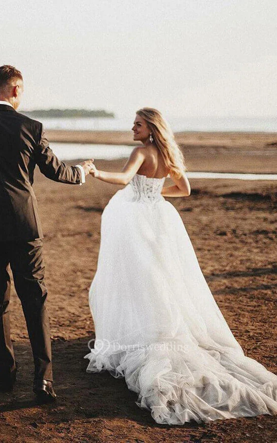 Sweetheart A-line Tulle Lace up Beach Wedding Dress with Lace Top and Court Train