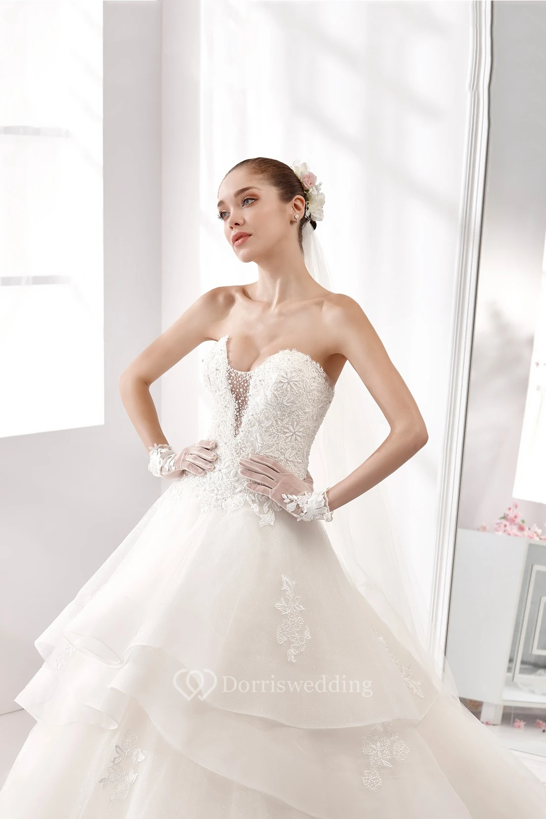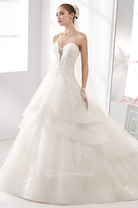 Sweetheart A-Line Wedding Gown with Lace Appliques Bodice and Tiers Skirt