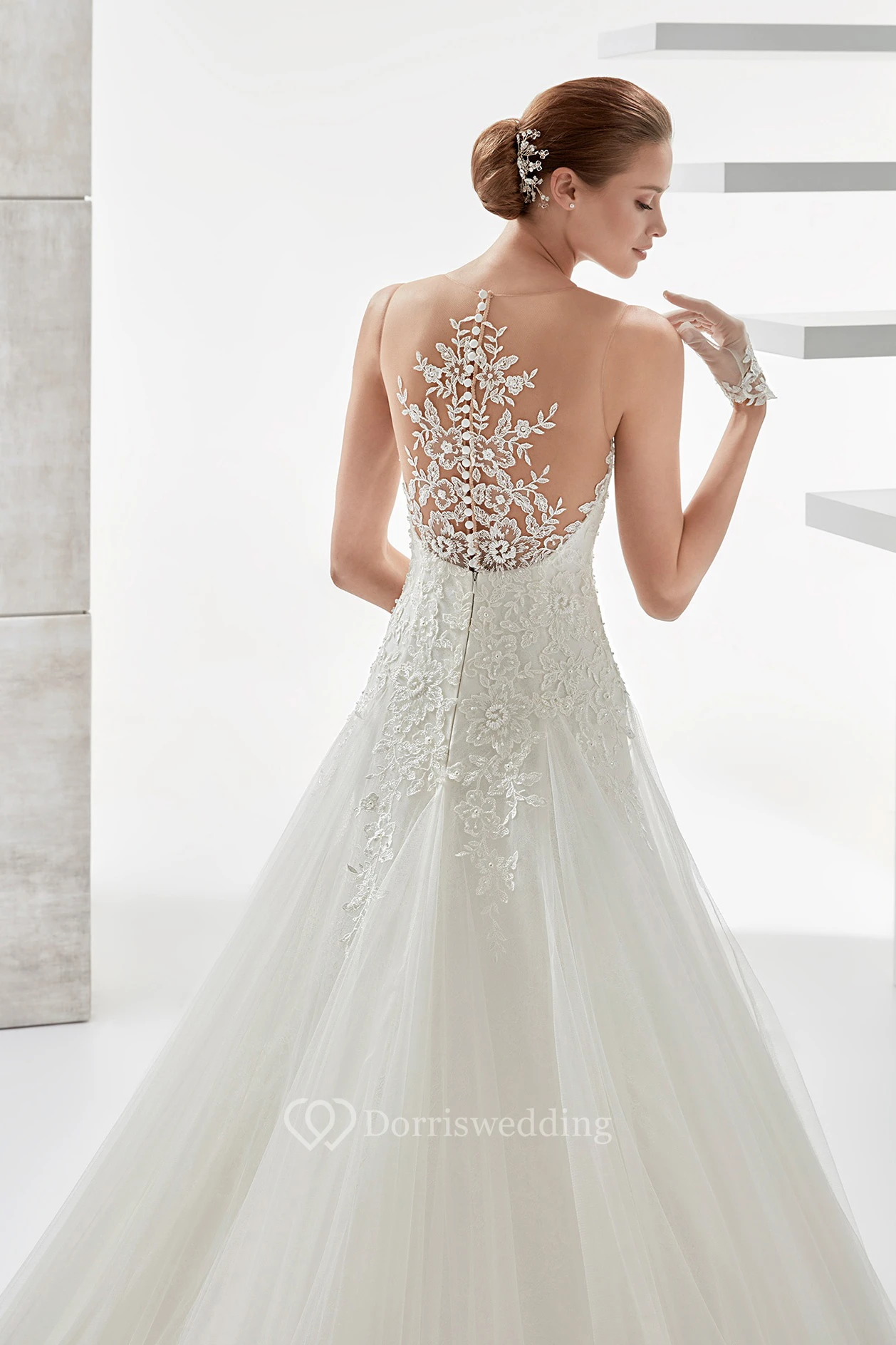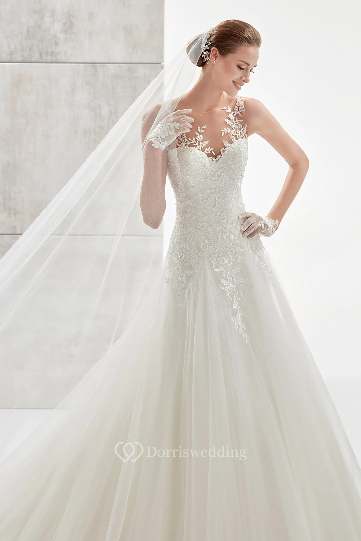 Sweetheart Appliqued A-Line Wedding Dress With Pleated Tulle Skirt And Illusive Floral Back