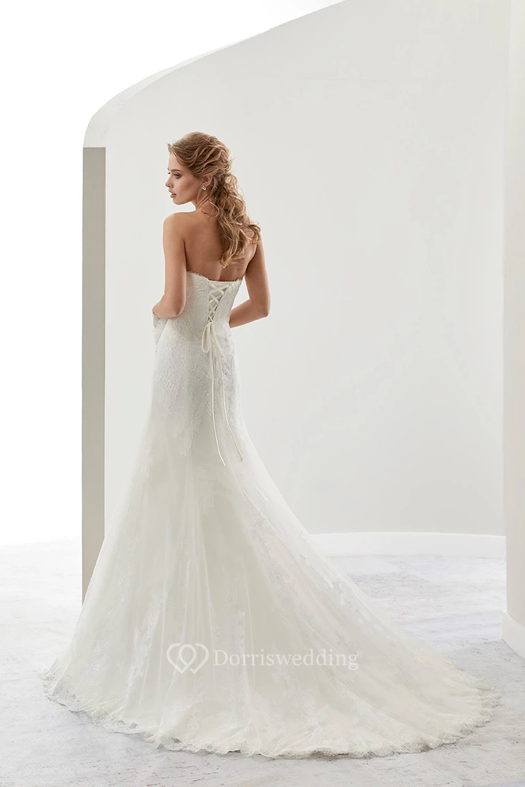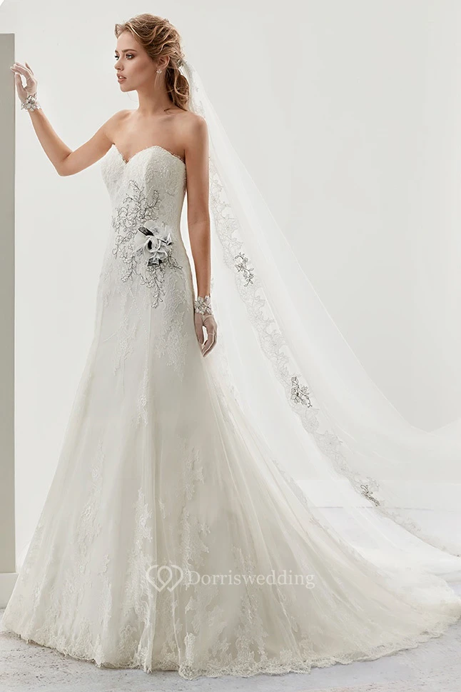 Sweetheart Beaded Flower Lace Bridal Gown with Brush Train and Lace-up back
