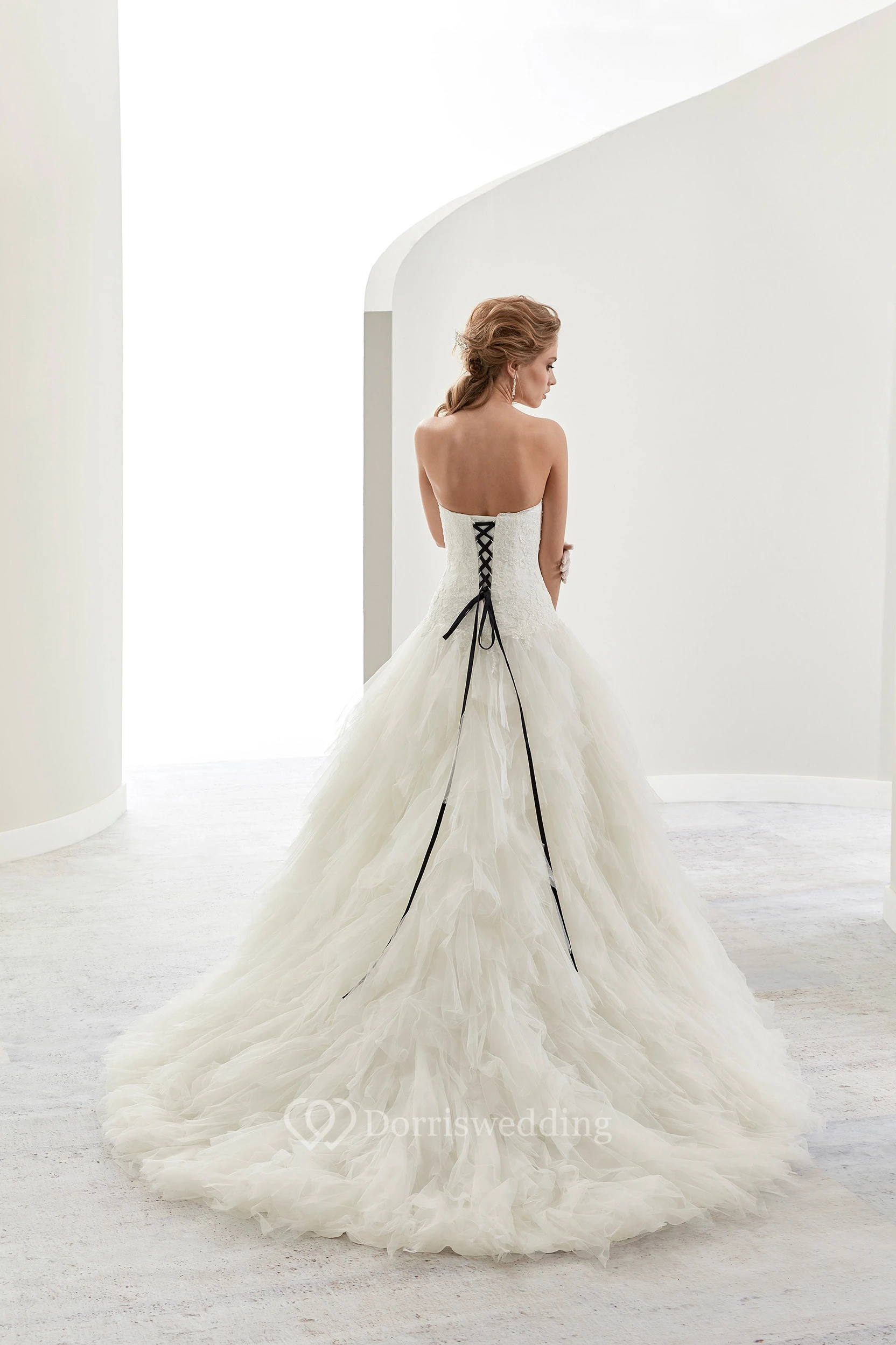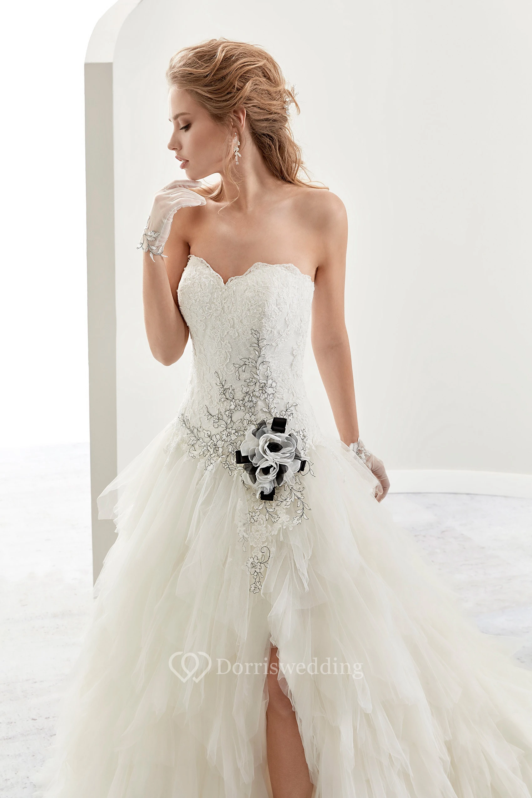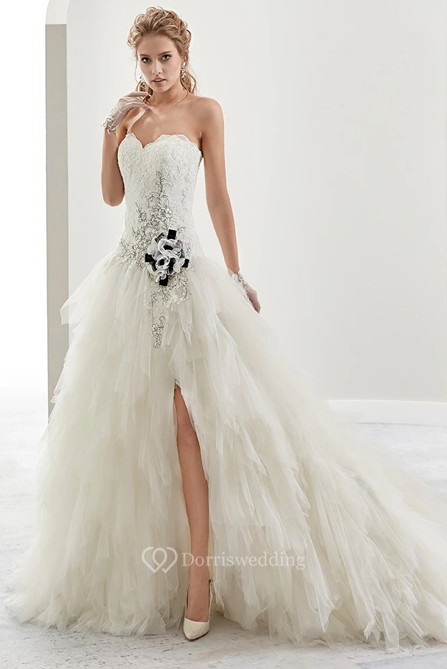 Sweetheart Beaded Flower Lace Bridal Gown with Side Split and Ruffles