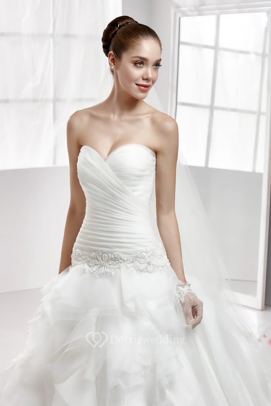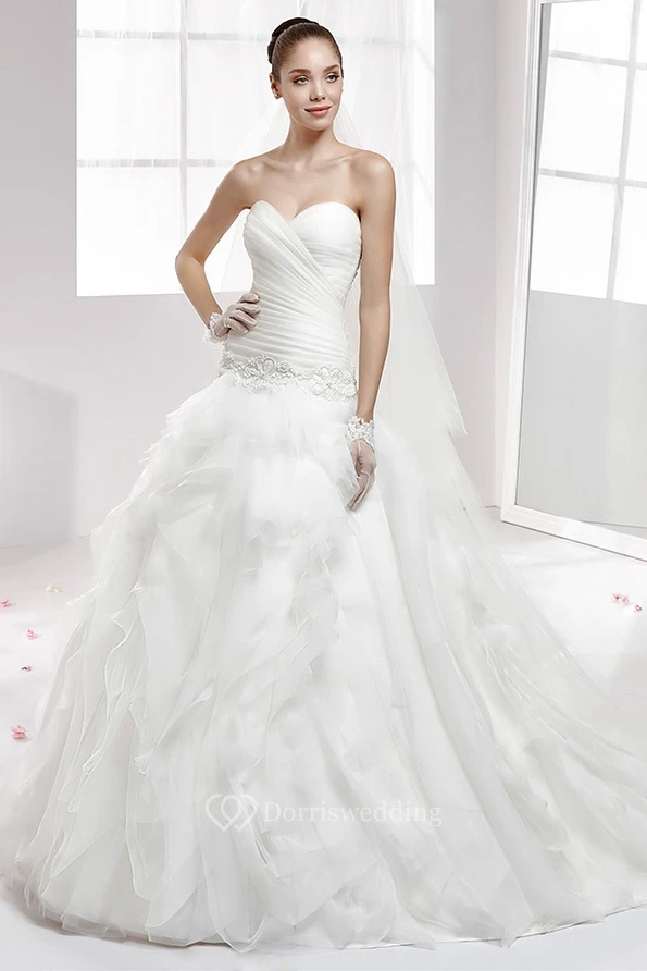 Sweetheart Beaded Wedding Gown With Cascading Ruffles and Pleated Bodice