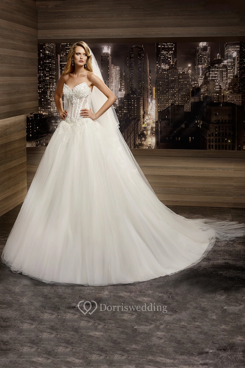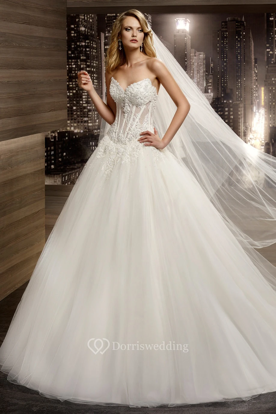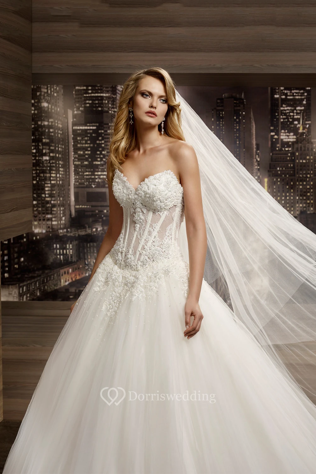Sweetheart Brush-Train A-Line Bridal Gown With Lace Corset And Appliques