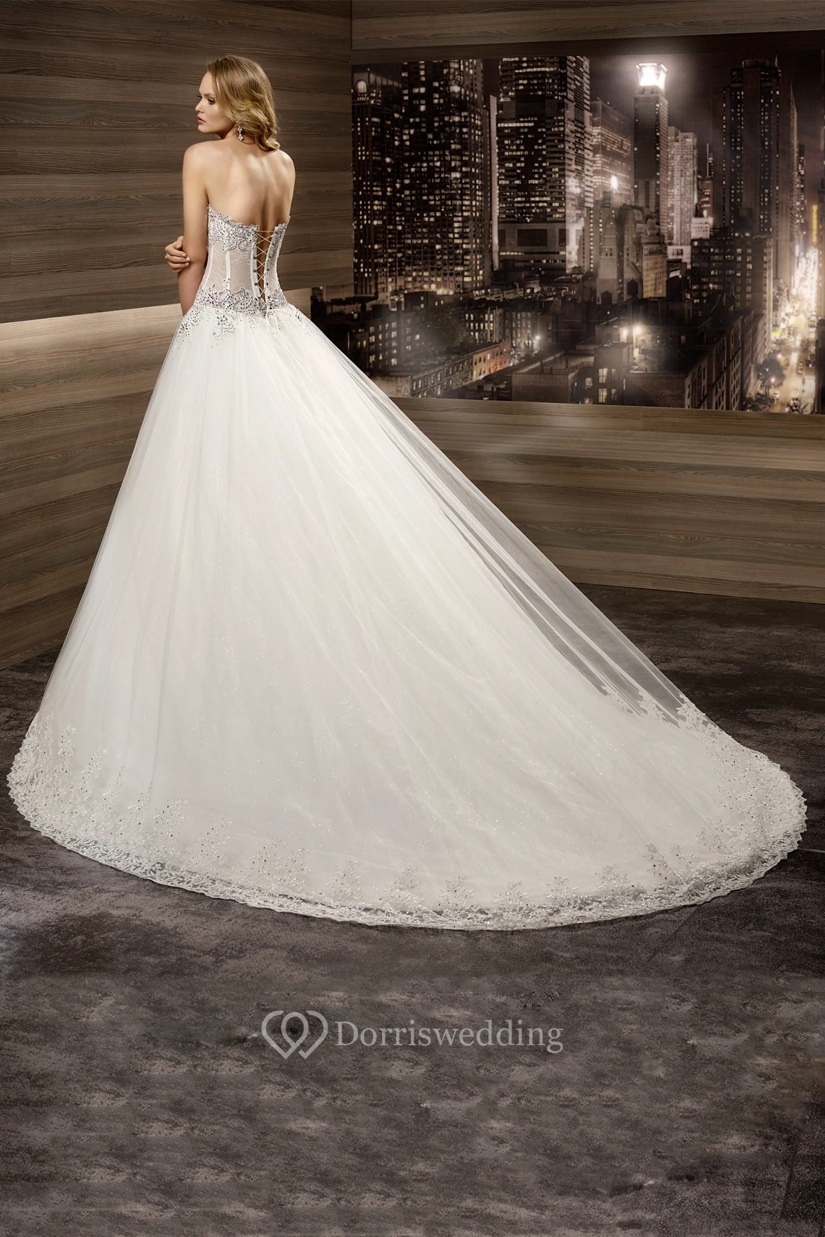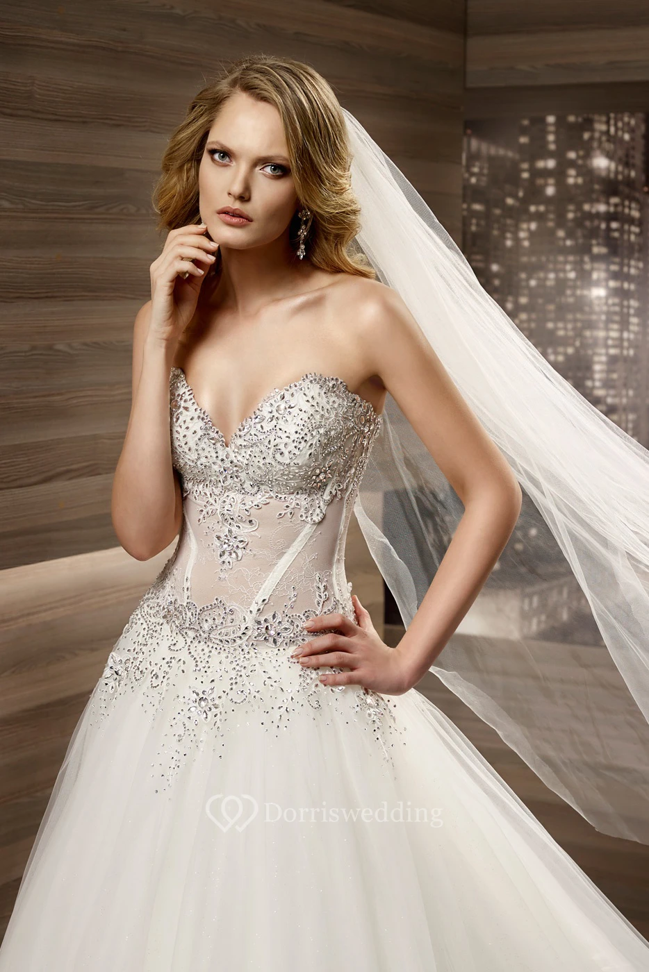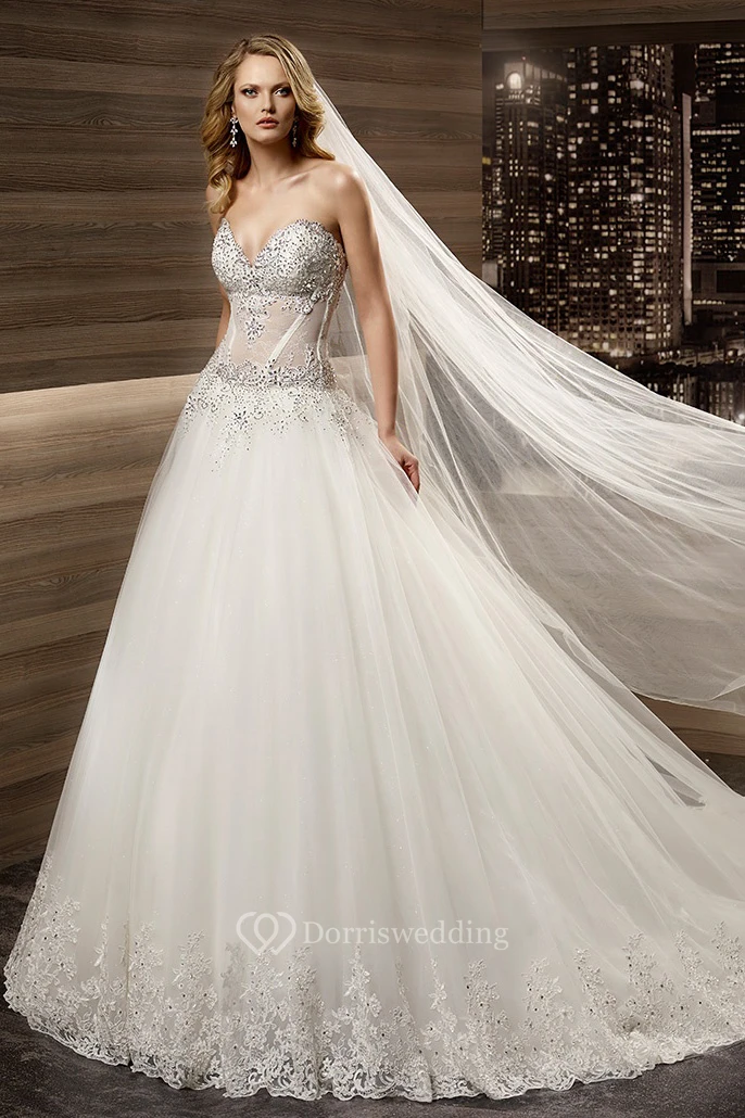 Sweetheart Brush-train A-line Wedding Dress with Beaded Illusion Corset
