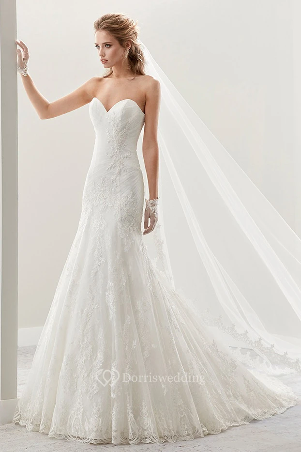 Sweetheart Brush-Train Lace Bridal Gown With Pleated Details And Lace-Up Back