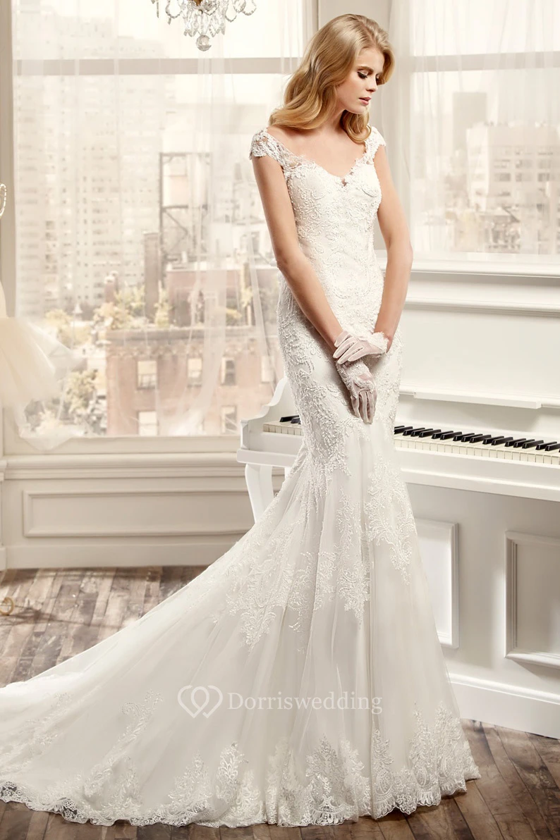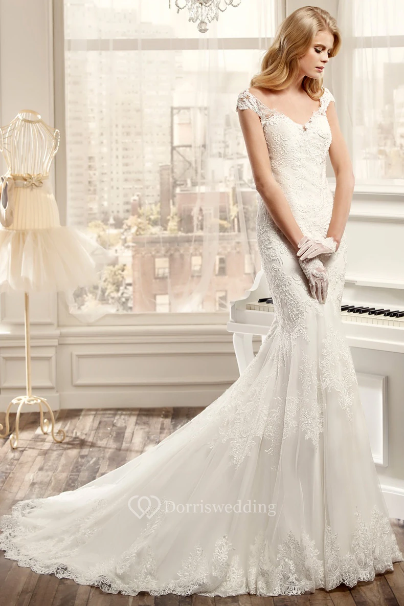 Sweetheart Cap-Sleeve Mermaid Wedding Dress With Appliques And Brush Train