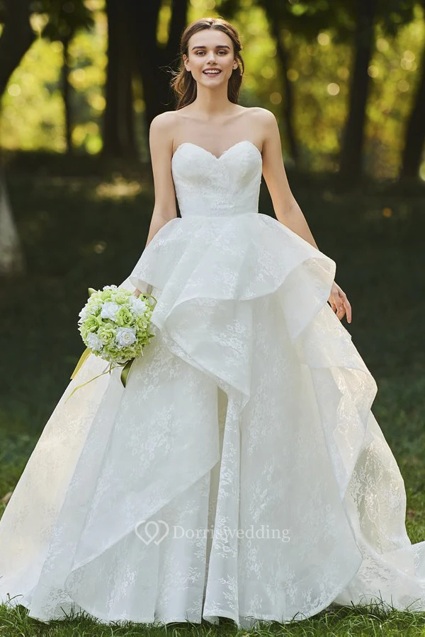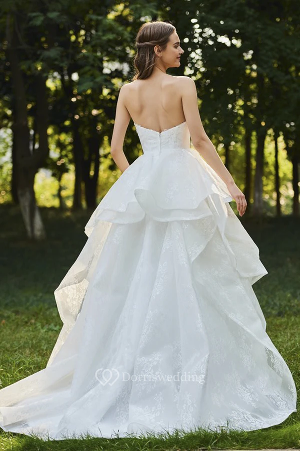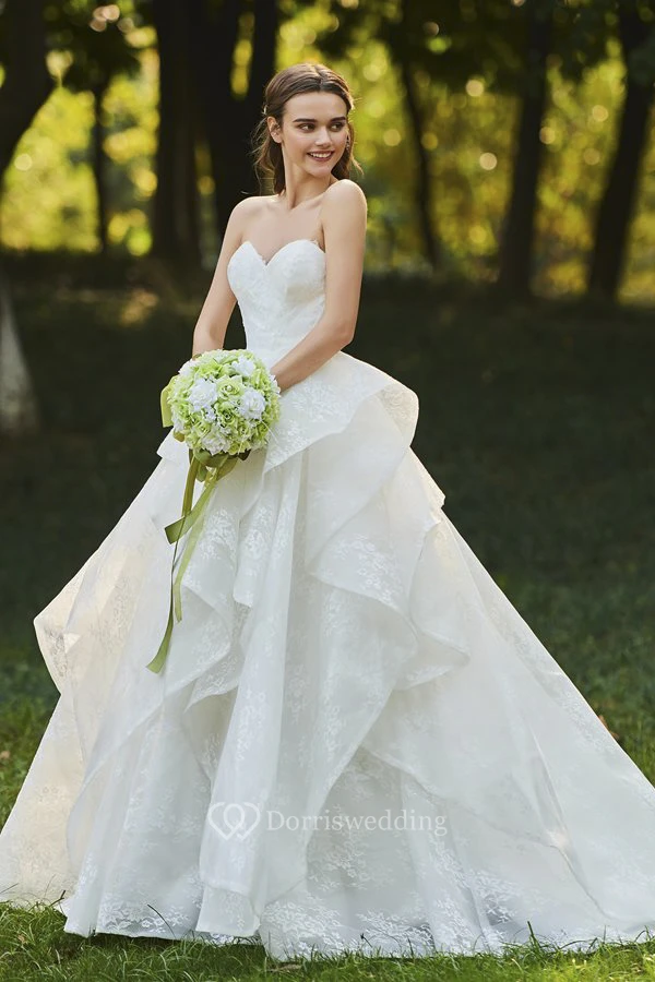 Sweetheart Cascading Ruffles Sleeveless Open Back Lace Bridal Ball Gown