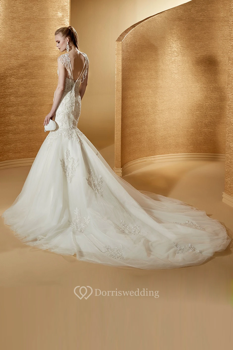 Sweetheart Court-train Mermaid Wedding Gown with Fine Appliques and Spaghetti Straps