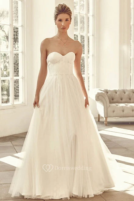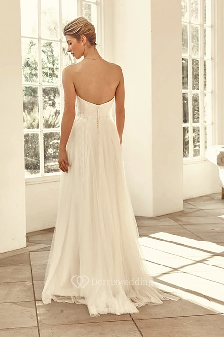 Sweetheart Floor-Length Pleated Tulle Wedding Dress With Brush Train And V Back