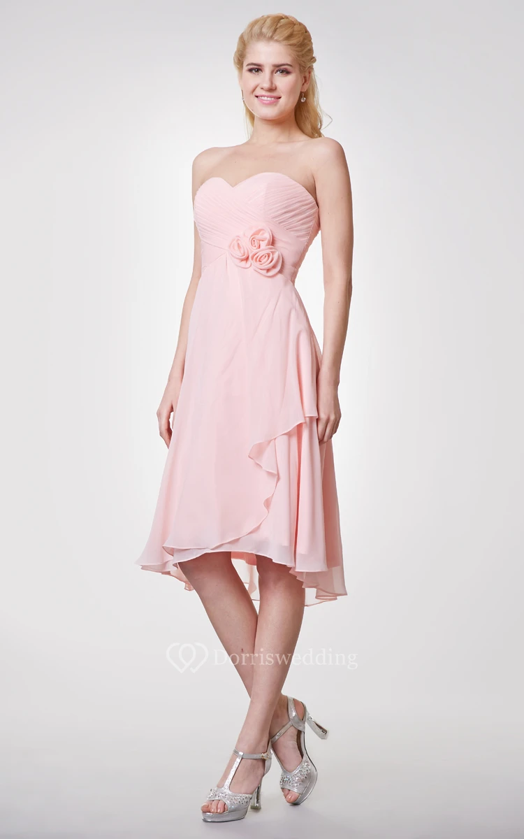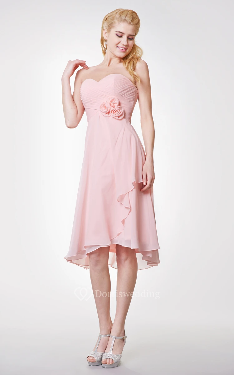 This feminine strapless sweetheart high low a-line chiffon dress with flowers and side draping is the perfect choice for any fashionable bridal party. The modern sweetheart neckline is accented with delicate ruching in an edgy crisscross style pattern. Eye-catching floral rosettes decorate the waistline and are complemented by a stunning side drape for a truly dazzling touch to an elegant gown.