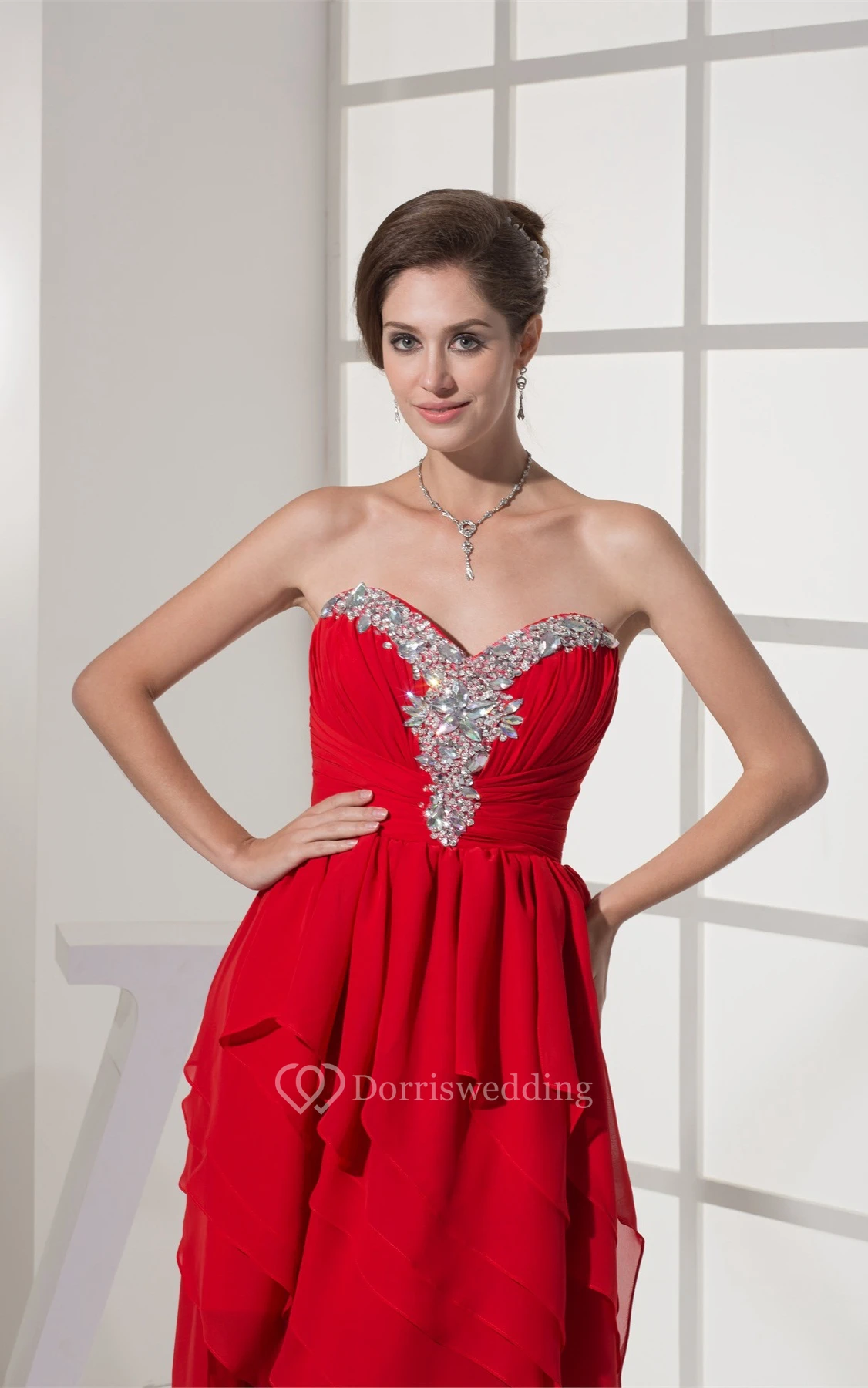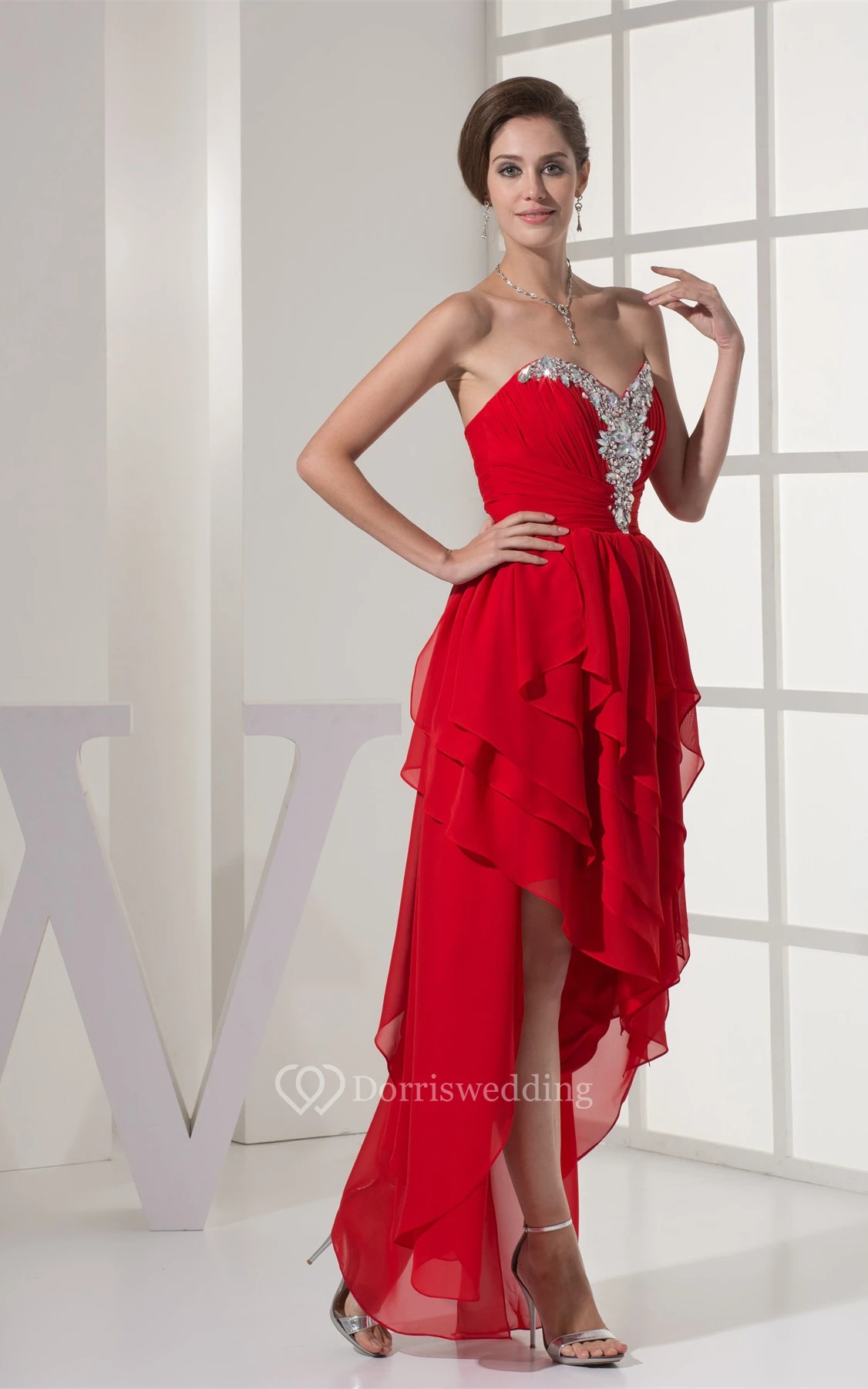 Sweetheart High-Low Jeweled Rhinestone and Dress With Ruffles
