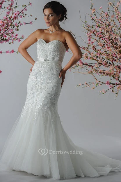 Sweetheart Lace Top Mermaid Bridal Gown With Satin Sash And Tulle Skirt