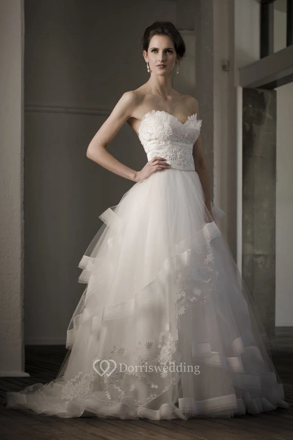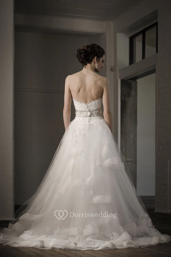 Sweetheart Long Appliqued Tulle Wedding Dress With Sweep Train And V Back