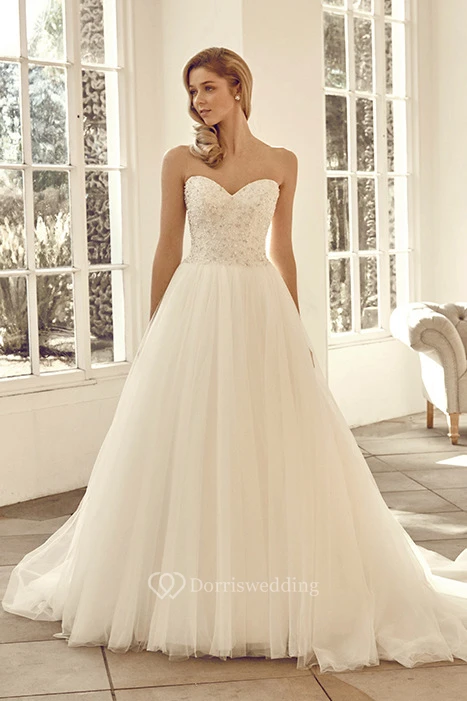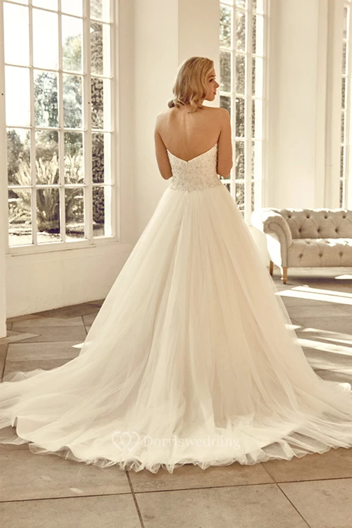 Sweetheart Long Beaded Tulle Wedding Dress With Chapel Train And V Back