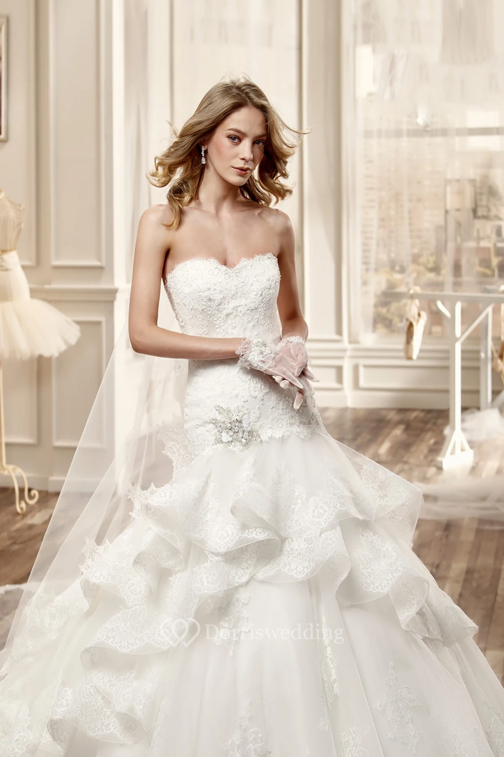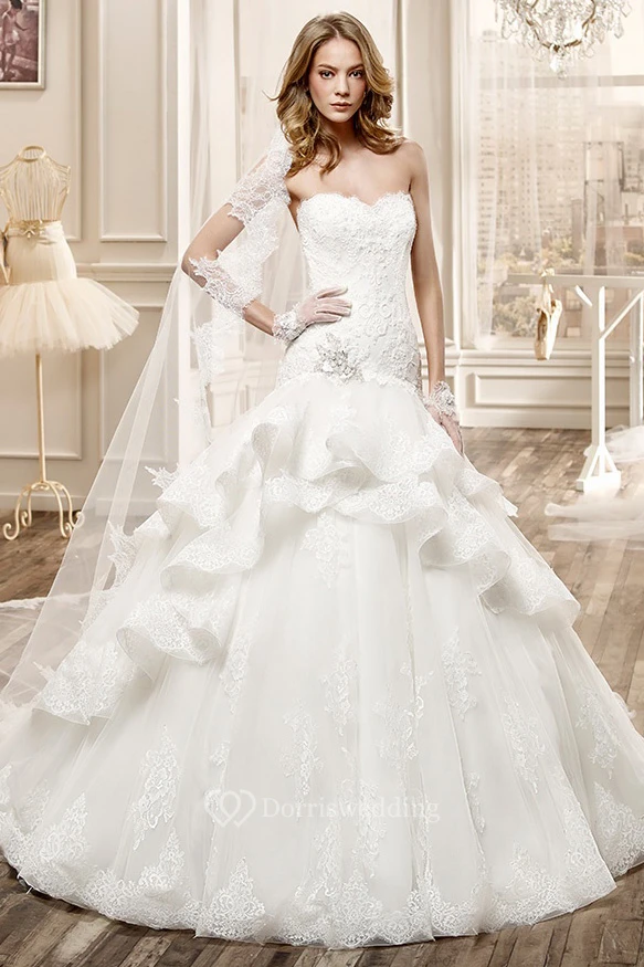 Sweetheart Long Lace Wedding Dress With Ruffles And Tiers Train