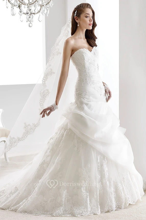 Sweetheart Pleated Lace Wedding Gown with Appliques and Side Draping Ruffles