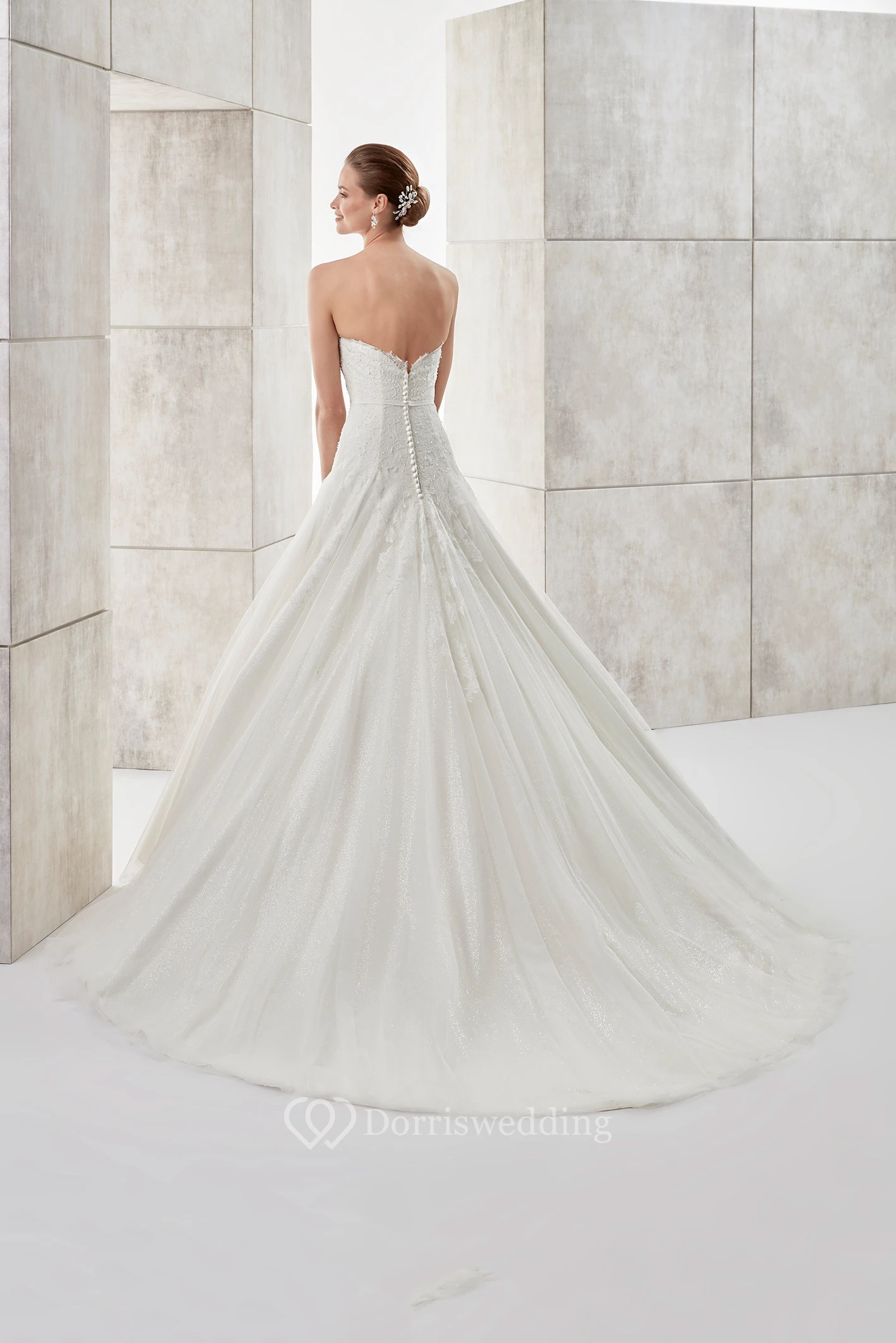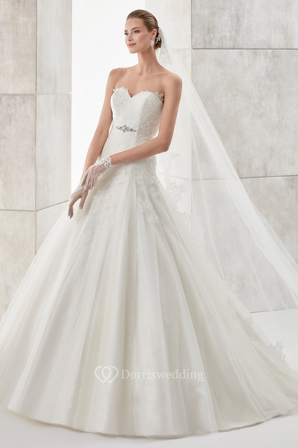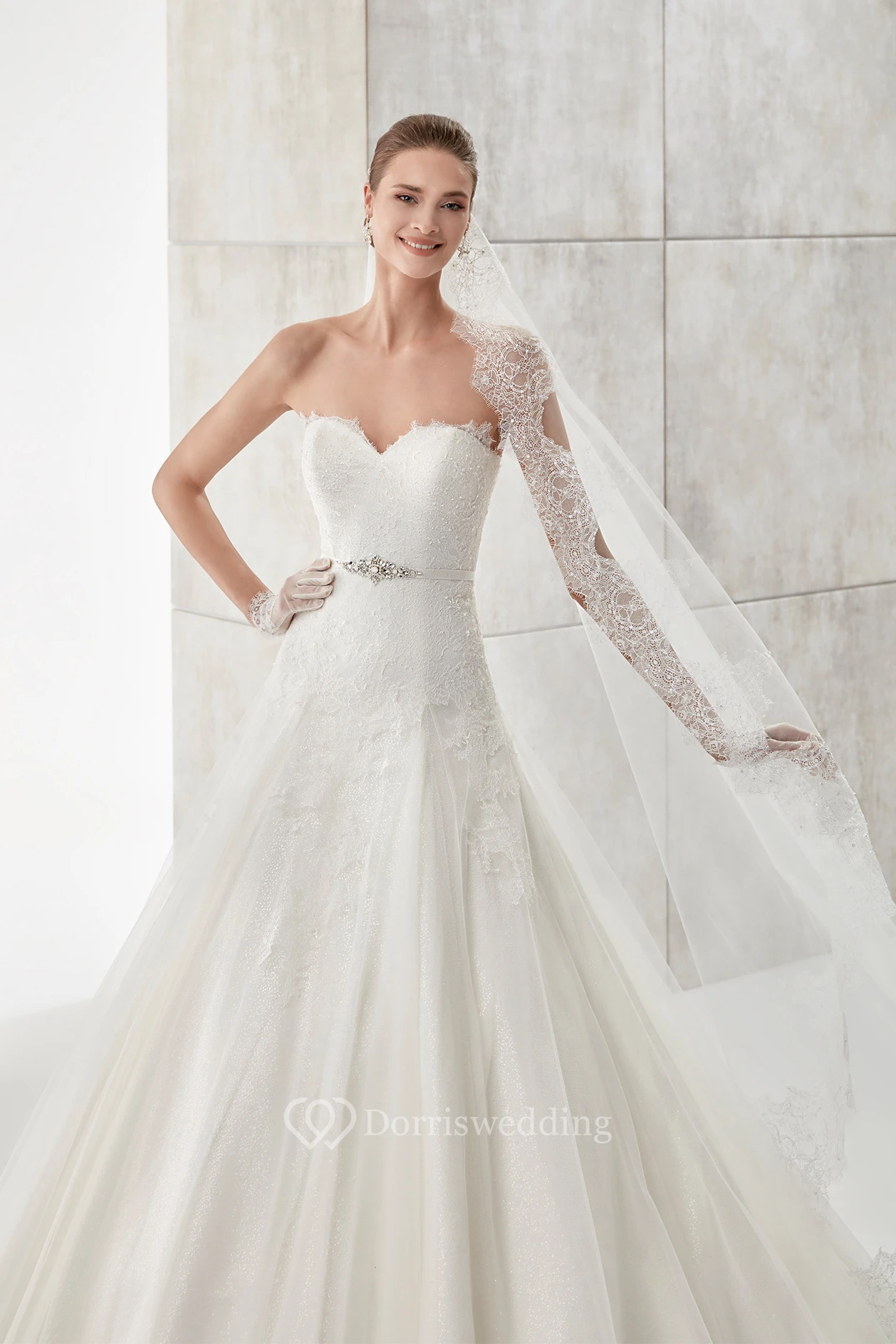 Sweetheart Pleating A-line Wedding Dress with Beaded Belt and Lace Bodice
