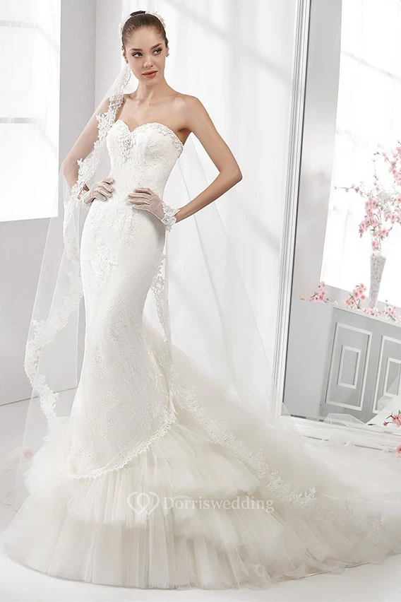 Sweetheart Sheath Lace Gown With Floral Bust And Tiers Train