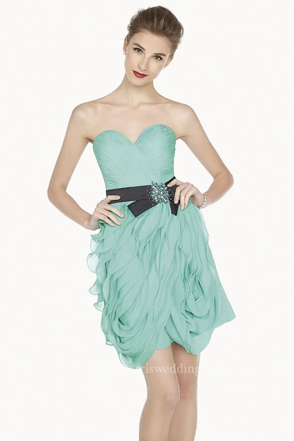 Sweetheart Sheath Mini Prom Dress With Floral Sash And Ruffles