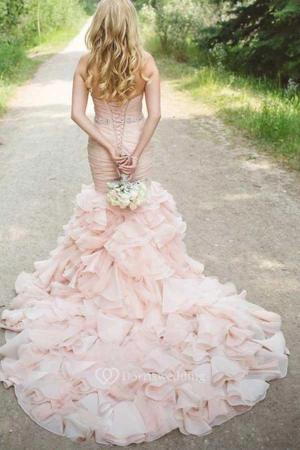 Sweetheart Tiered Train Organza Mermaid Wedding Dress Styles with Beading