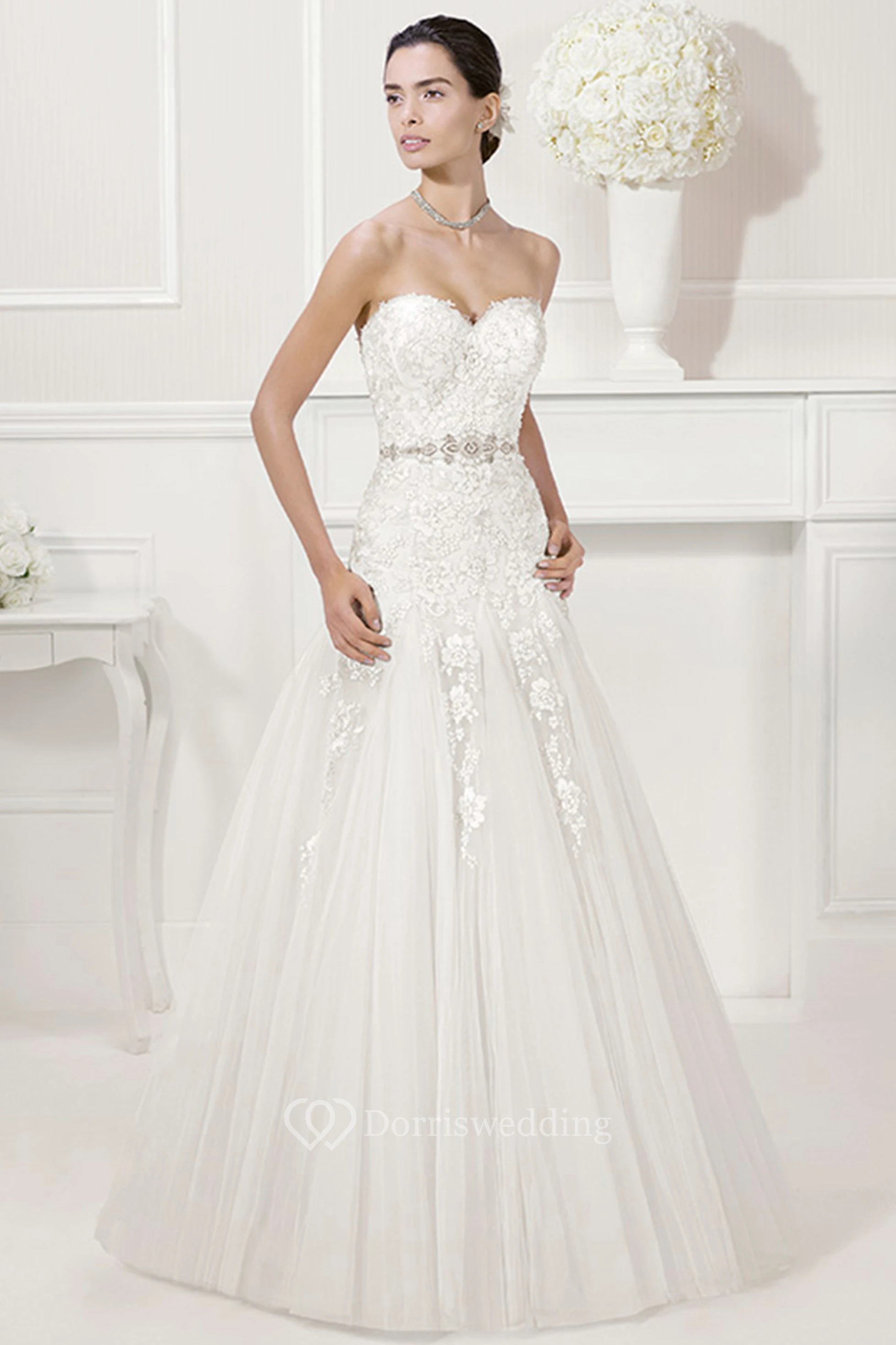 Sweetheart Tulle A-Line Bridal Gown With Lace And Beading Waist