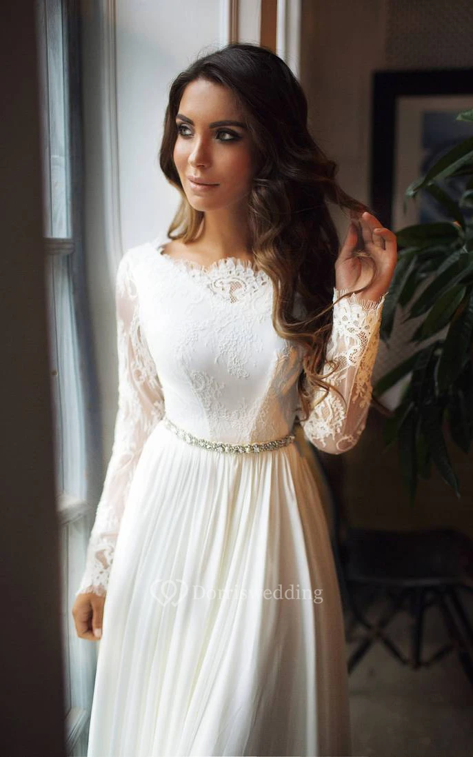 Taffeta Lace Floor-length Brush Train A Line Long Sleeve Modest Wedding Dress