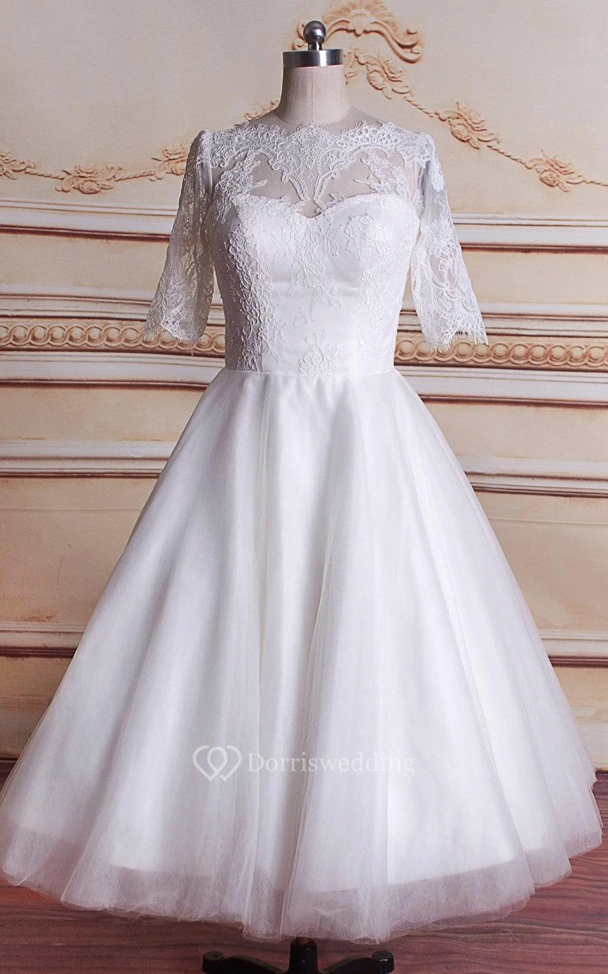 Tea-Length 3-4 Sleeve Tulle Lace Satin Weddig Dress