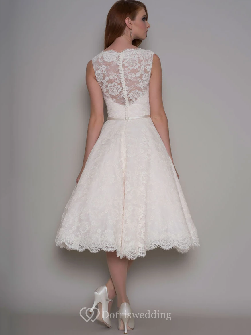 Tea-Length A-Line Appliqued V-Neck Sleeveless Lace Wedding Dress