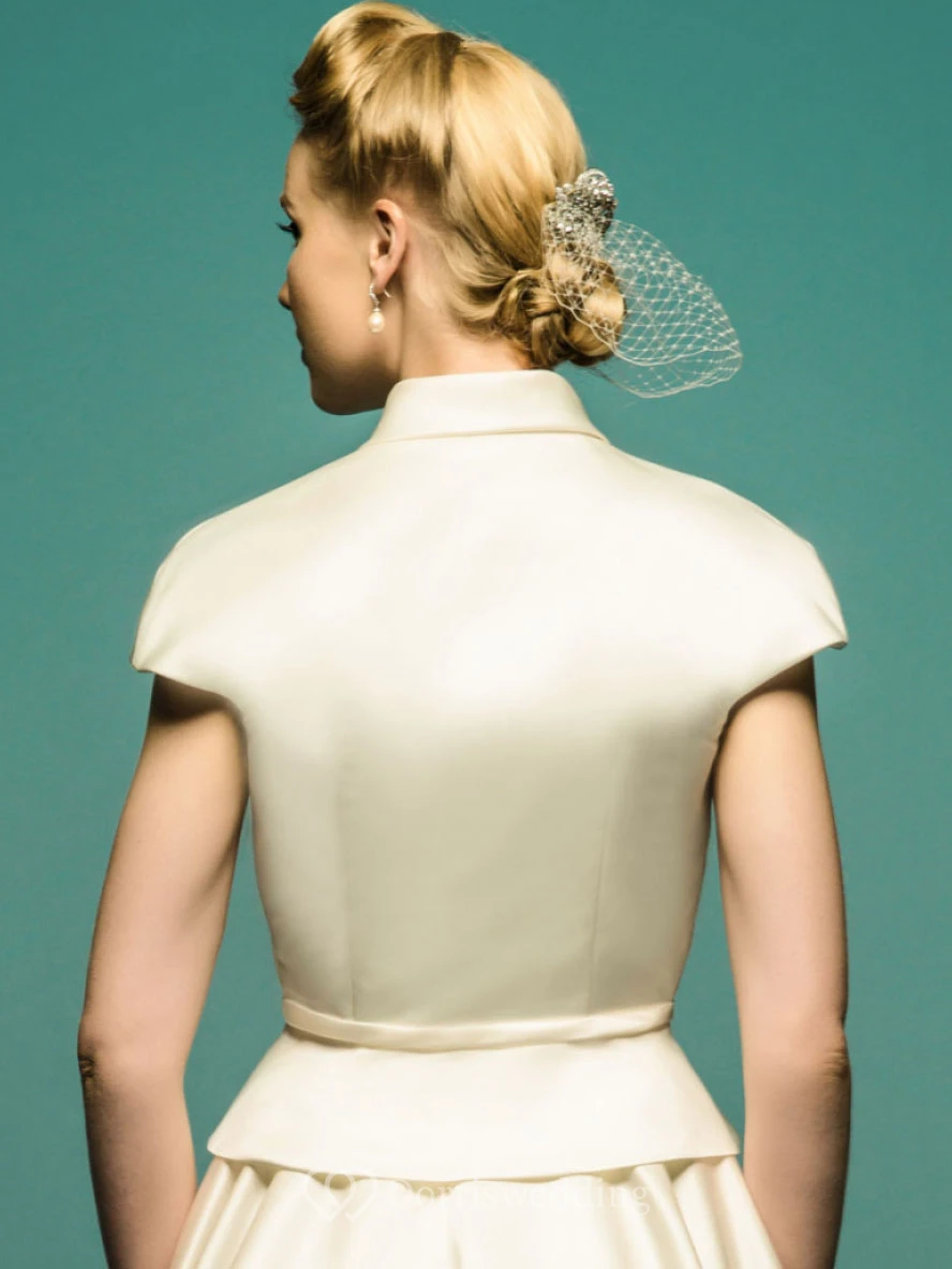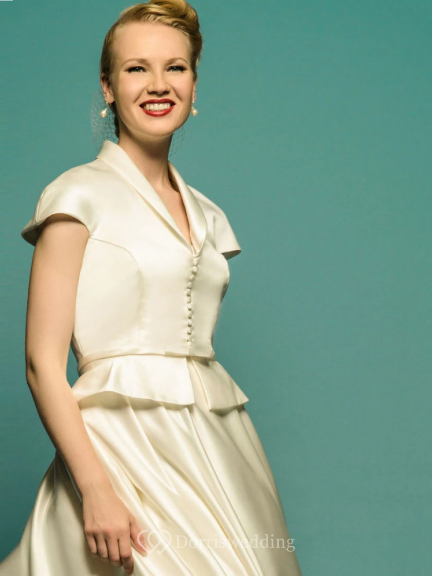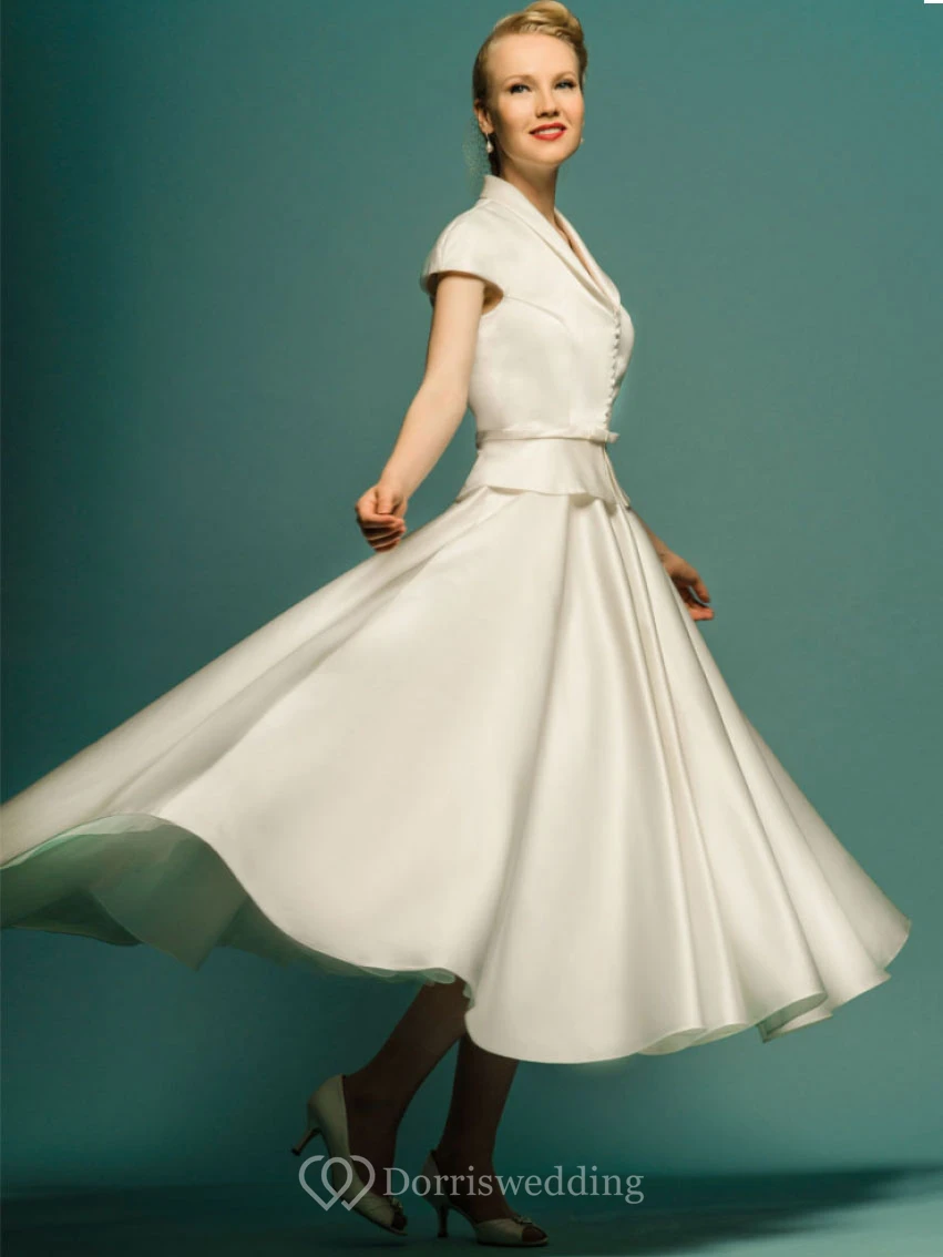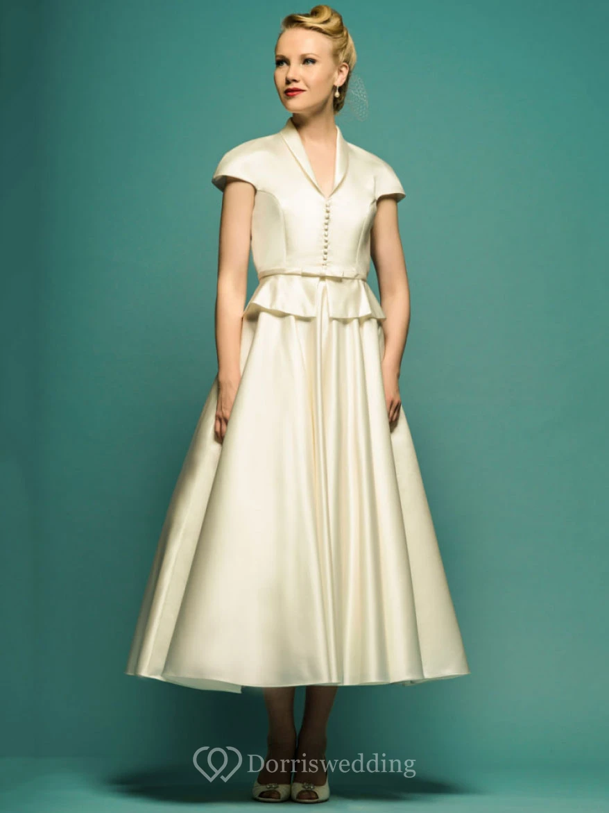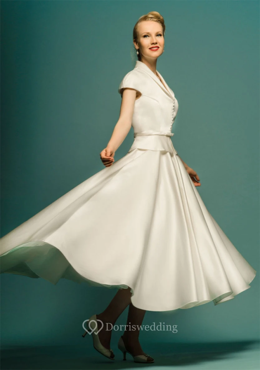 Tea-Length A-Line Scoop Neck Cap Sleeve Satin Vintage Wedding Dress