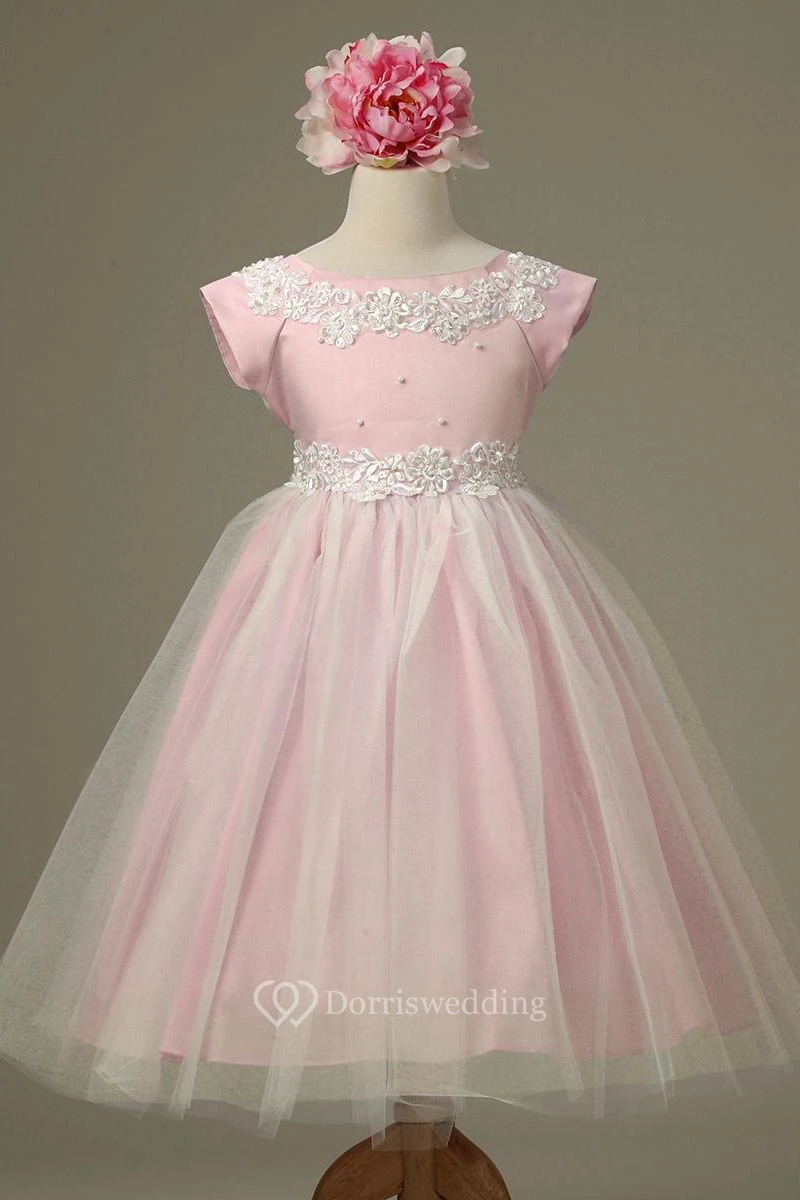Tea-Length Appliqued Cap-Sleeve Tulle&Lace Flower Girl Dress