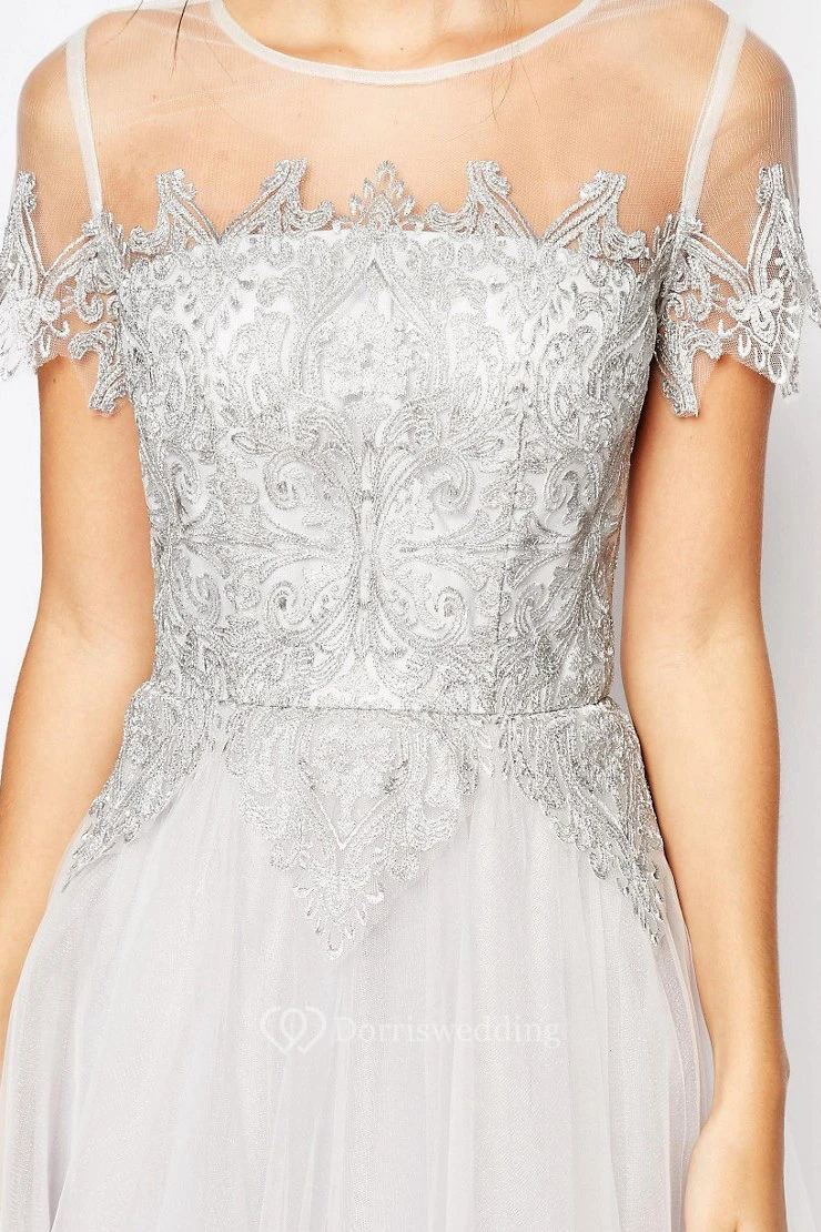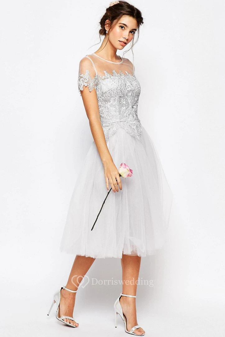 Tea-Length Appliqued Short Sleeve Scoop Neck Tulle Bridesmaid Dress