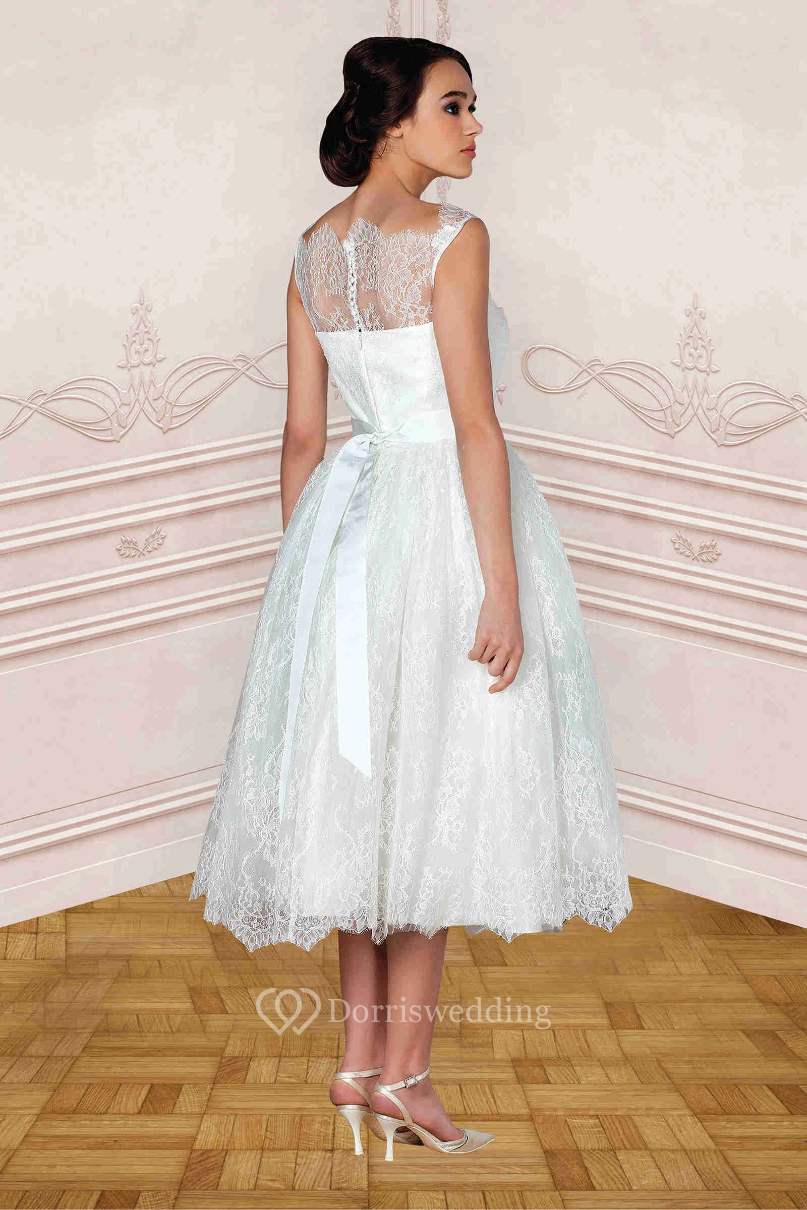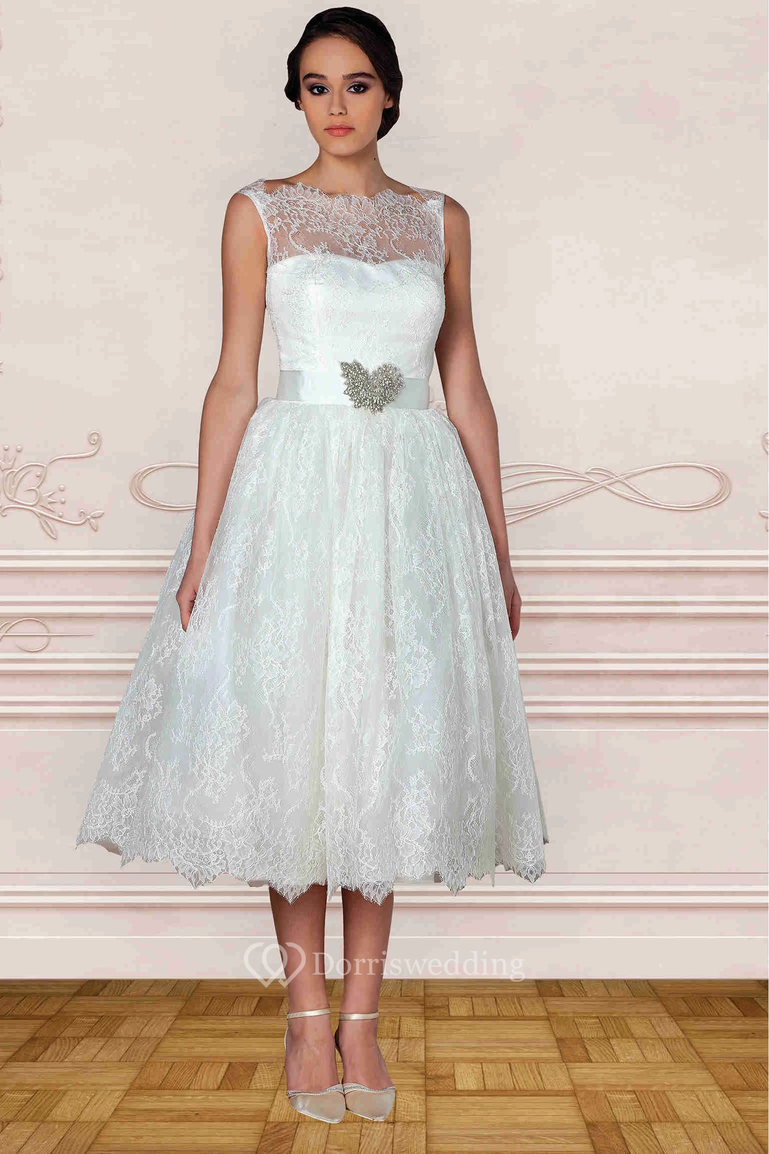 Tea-Length Bateau Jeweled Lace Wedding Dress With Ribbon And Illusion