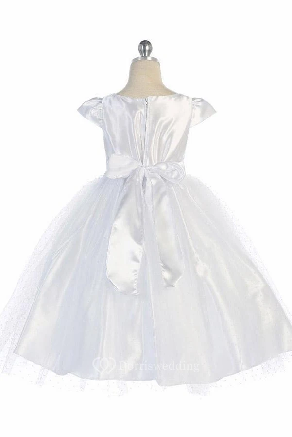 Tea-Length Beaded Cap-Sleeve Tulle&Satin Flower Girl Dress