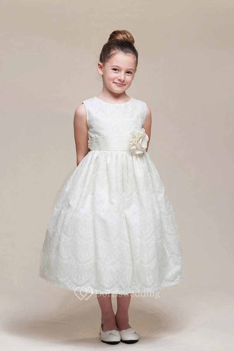 Tea-Length Beaded Floral Lace Flower Girl Dress With Ribbon
