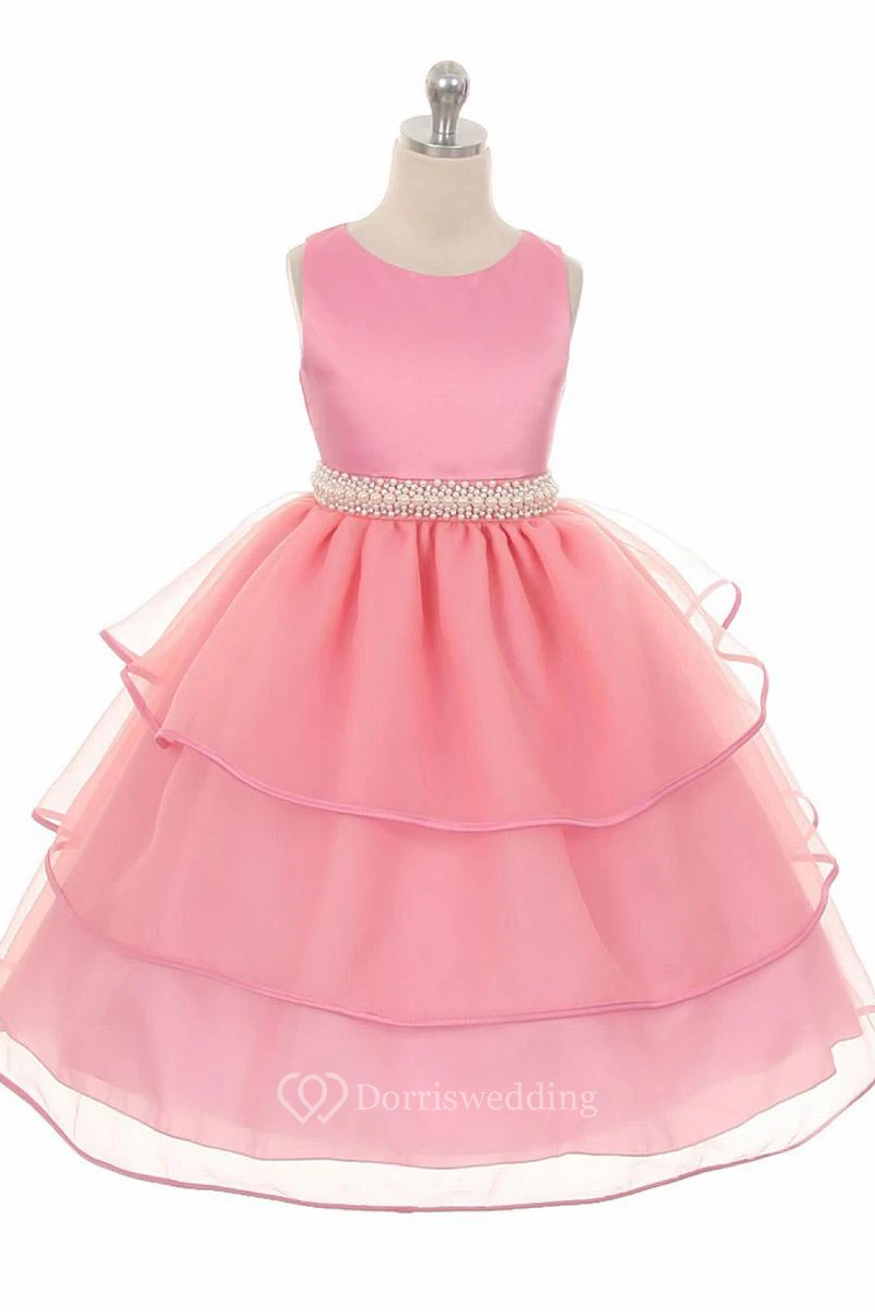 Tea-Length Beaded Sleeveless Organza&Satin Flower Girl Dress