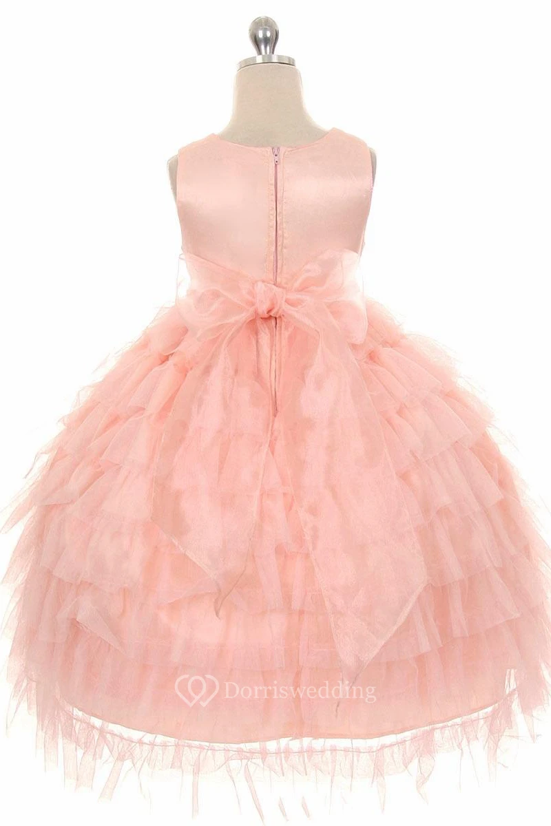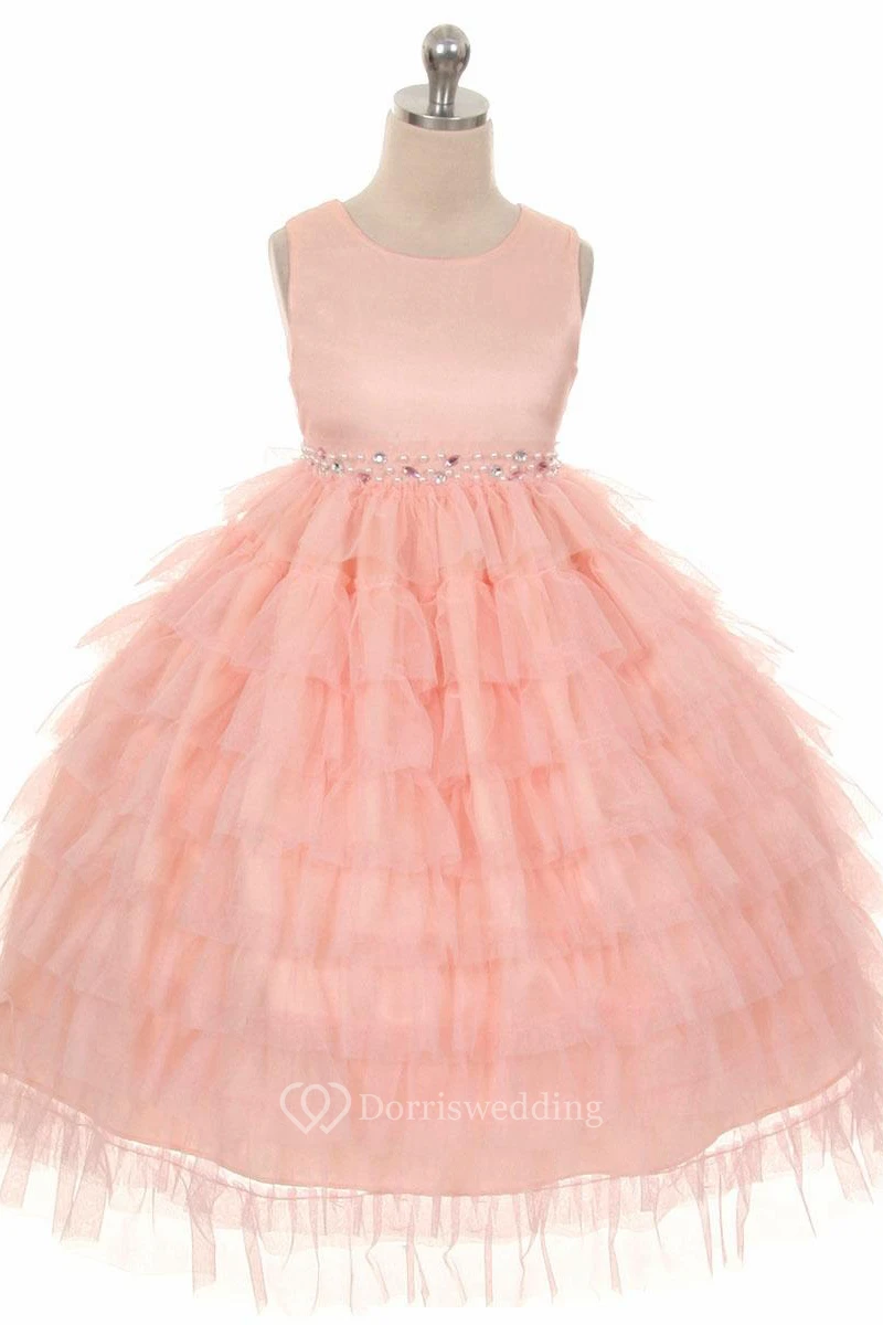 Tea-Length Beaded Tulle&Organza Flower Girl Dress With Ruffles