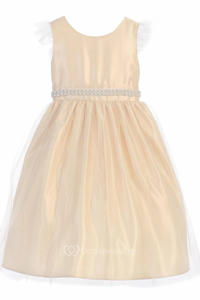 Tea-Length Beaded Tulle&Satin Flower Girl Dress