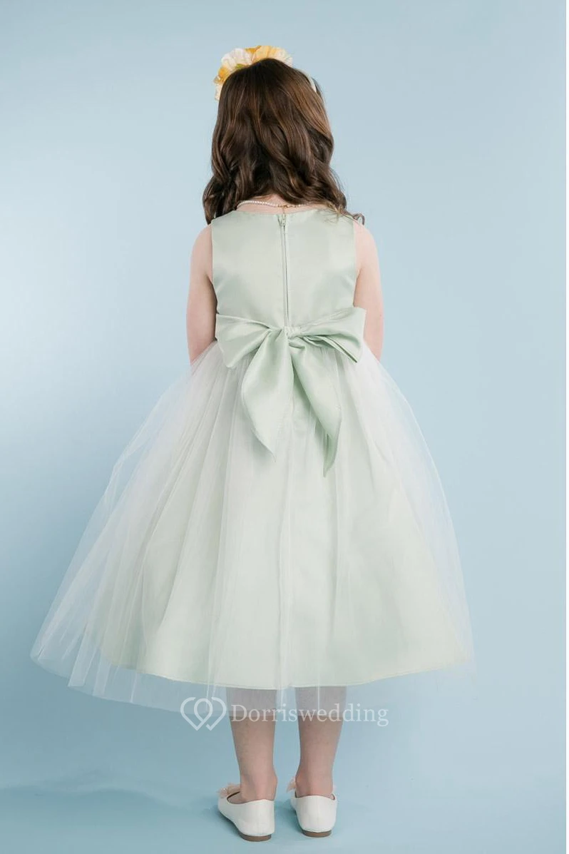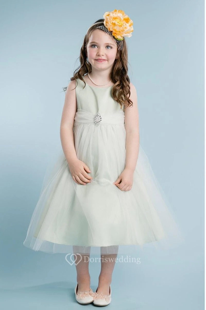 Tea-Length Beaded Tulle&Satin Flower Girl Dress With Broach
