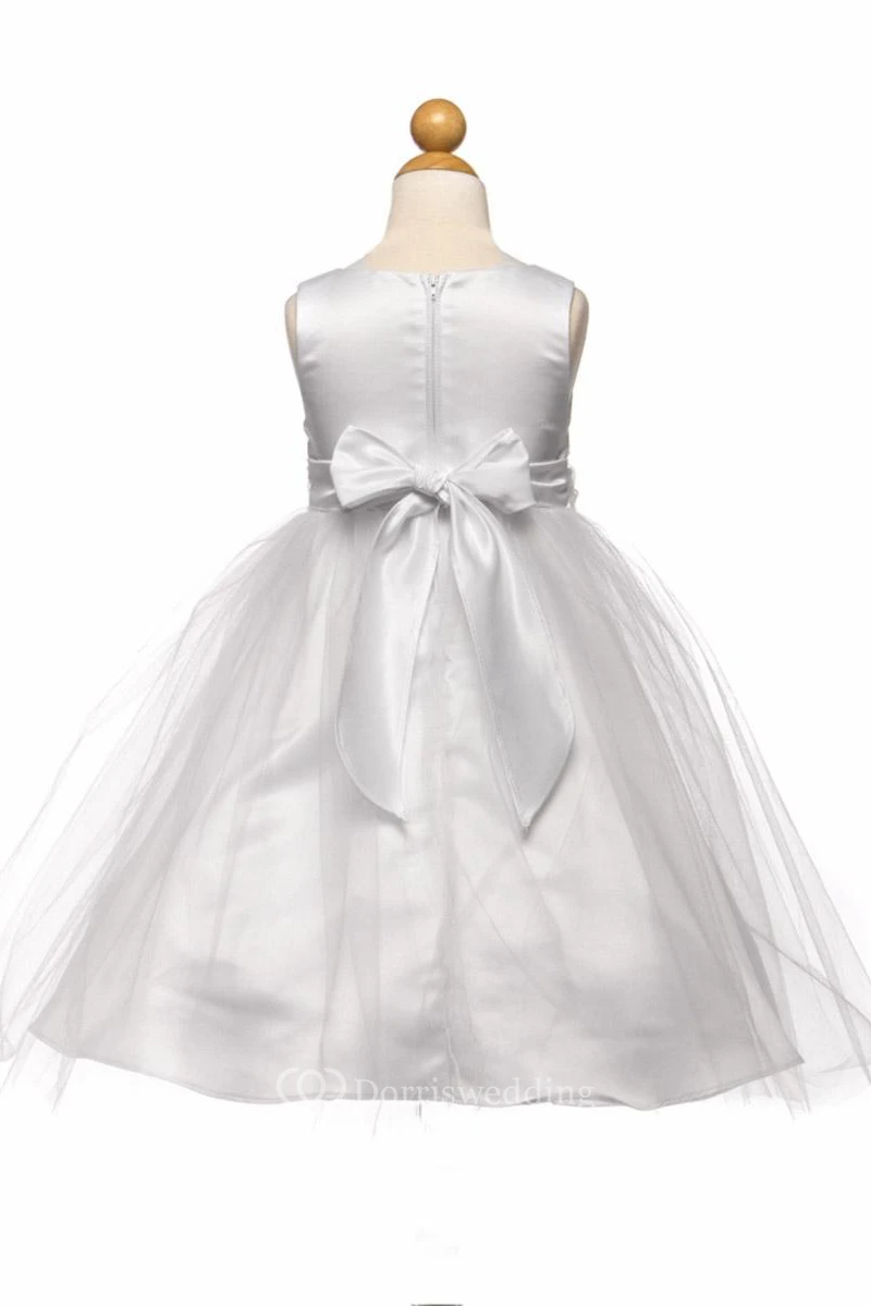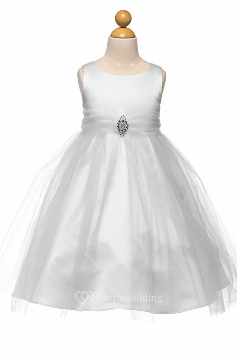 Tea-Length Beaded Tulle&Satin Flower Girl Dress With Broach