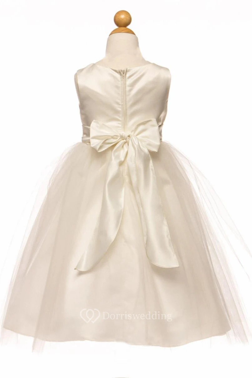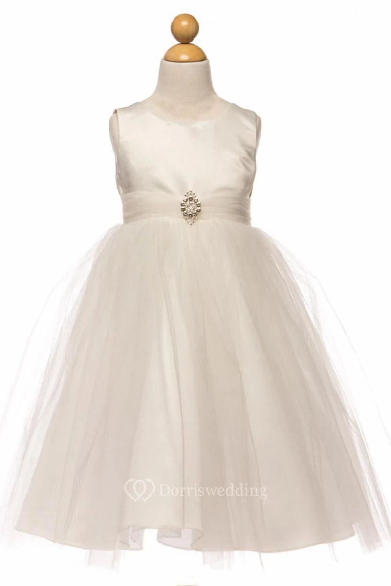 Tea-Length Beaded Tulle&Satin Flower Girl Dress With Broach
